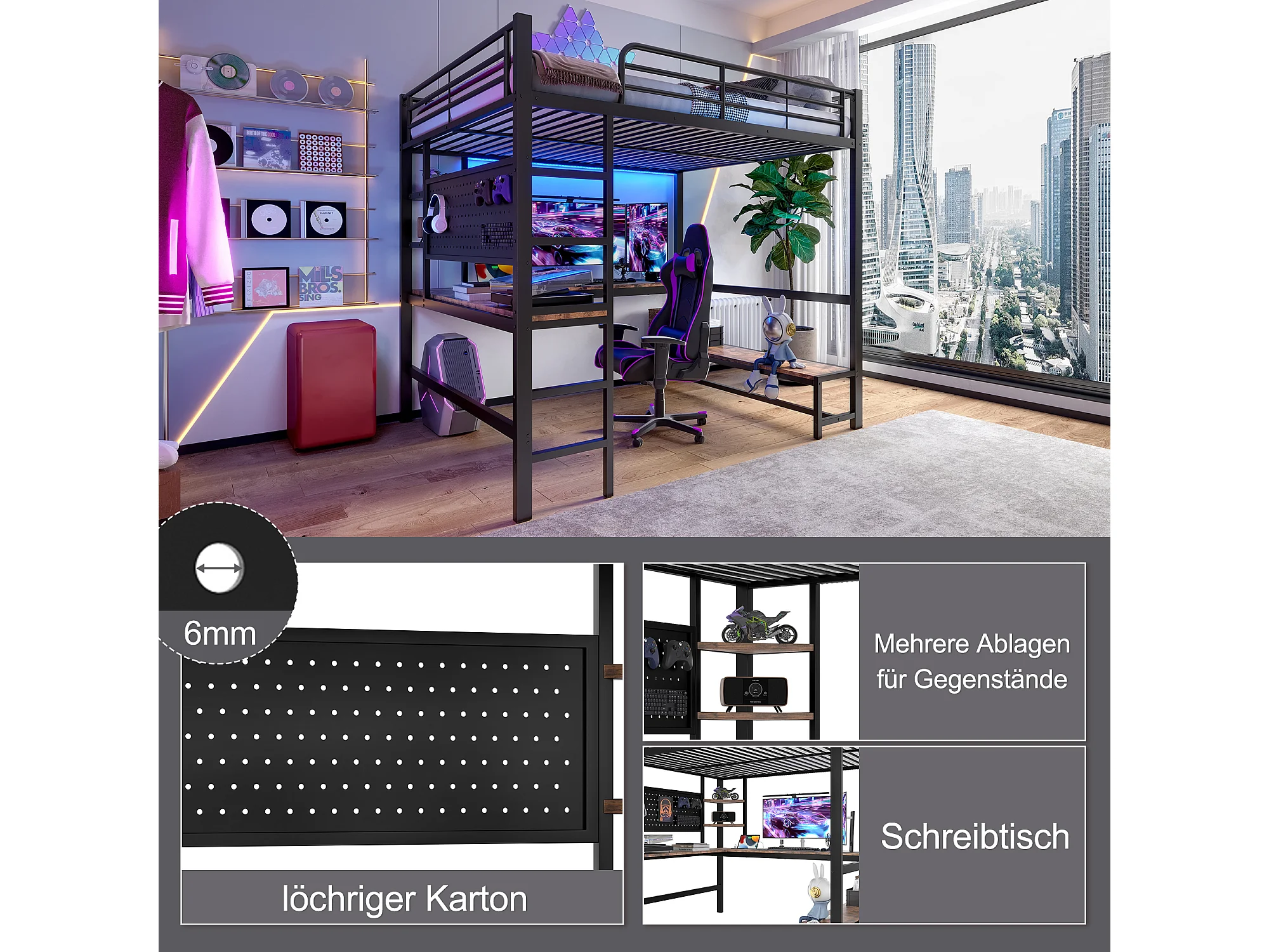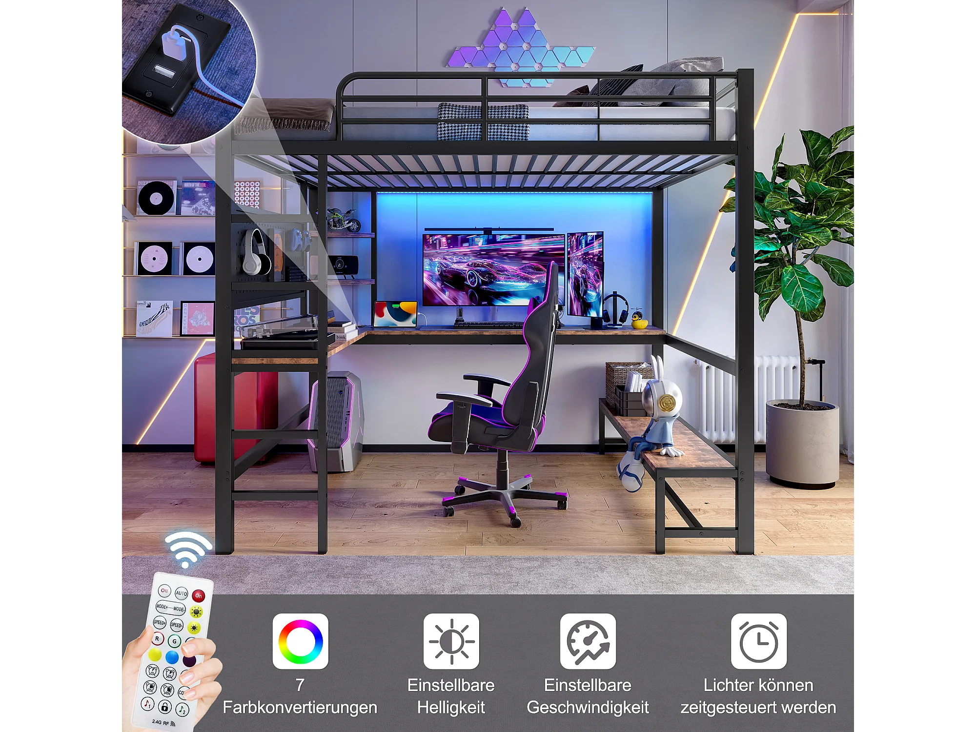 Soppalco illuminato 140x200 cm in metallo con scrivania rangements LED USB Type-C échelle noir