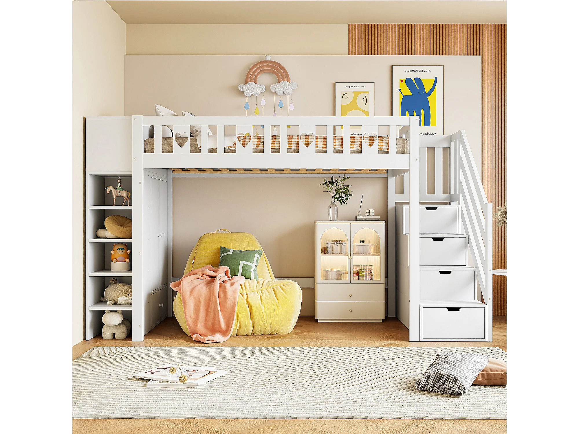 Soppalco illuminato 90x200 cm in legno MDF con cassettiera, ripiani, armadio pieghevole e spazio libero sotto la luce, bianco