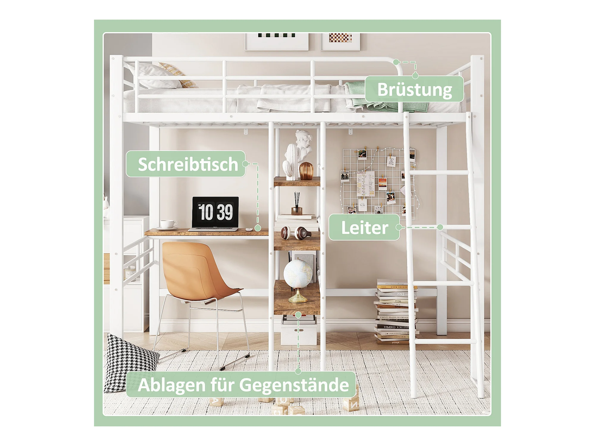 Letto a soppalco 90 x 200 cm con scrivania e scaletta, senza materasso, struttura in metallo, design per la casa, bianco (204 x 134 x 174 cm)