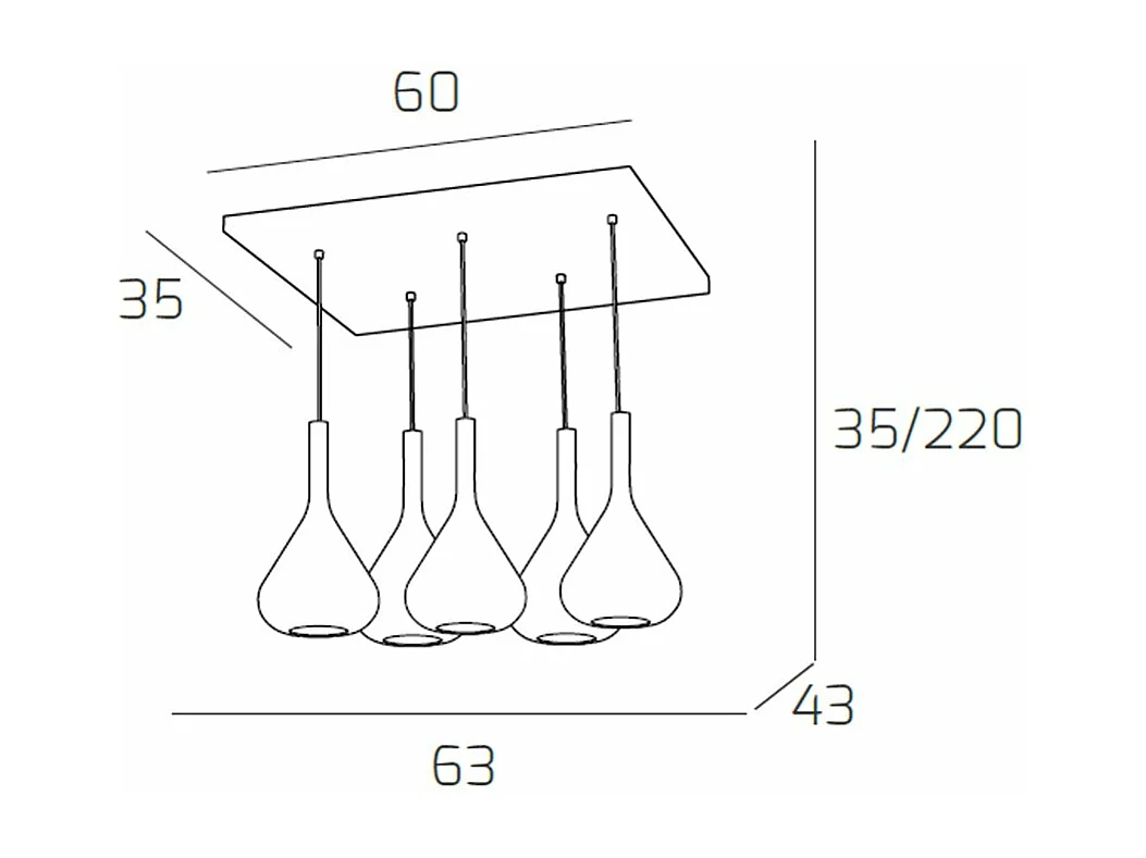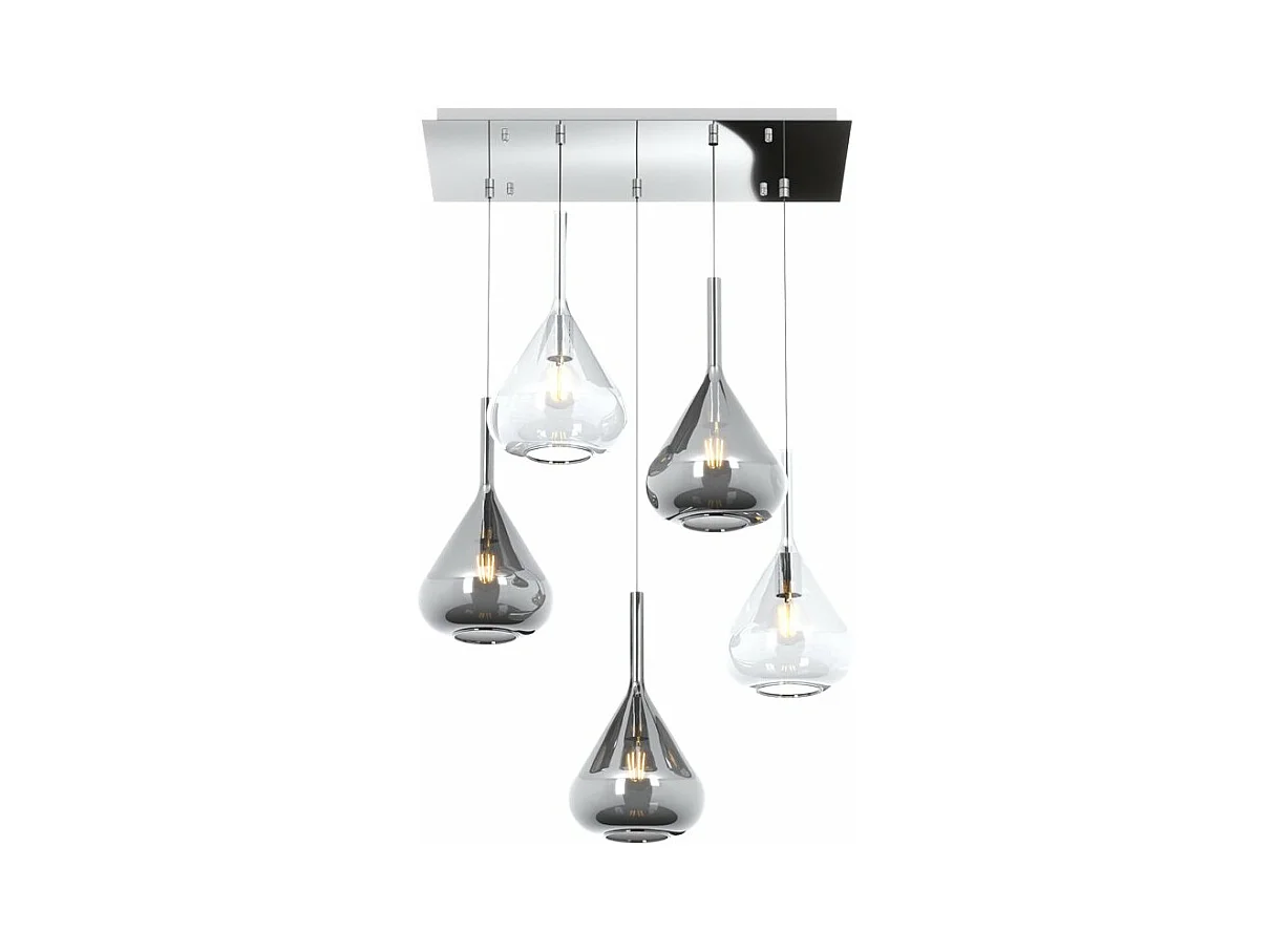 Sospensione 5 luci con struttura in metallo color cromo, un rosone rettangolare e 5 vetri pirex soffiato colore trasparente e fumè come diffusore.. Le finiture dei vetri disponibili sono trasparente, verde, blu, fumè ed ambra. Le strutture in metallo sono disponibili nelle finiture cromo, bianco e ottone satinato. Nella confezione sarà compreso il portalampada nelle finiture cromo, otttone satinato e bianco, dove il cliente al momento dell' installazione sarà libero di scegliere il colore desiderato.Questo articolo è disponibile in diverse finiture e/o dimensioni. E' possibile indicarlo nell'apposito campo NOTE presente in conclusione di ordine oppure contattarci dopo aver effettuatol'ordine.