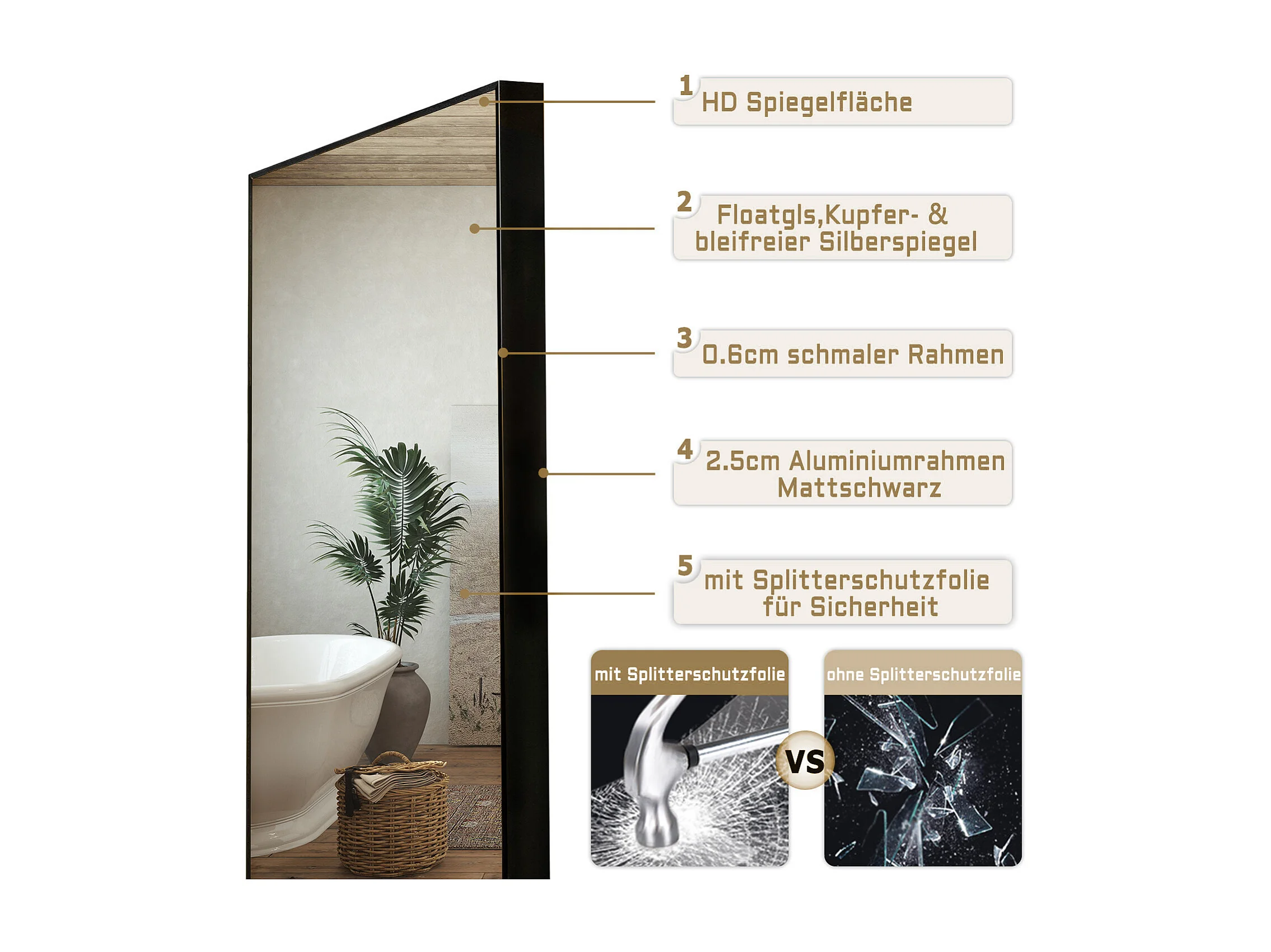 Specchio a figura intera, cornice in alluminio, argento, supporto nero, design moderno (45x37x158,5cm)