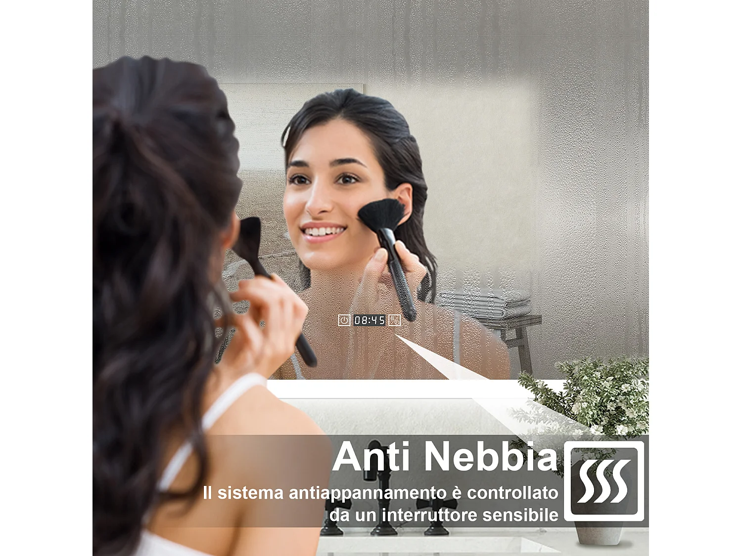 Specchio bagno Rettangolare 80x60cm Led Con 3 Luci + Orologio + Antiappannamento