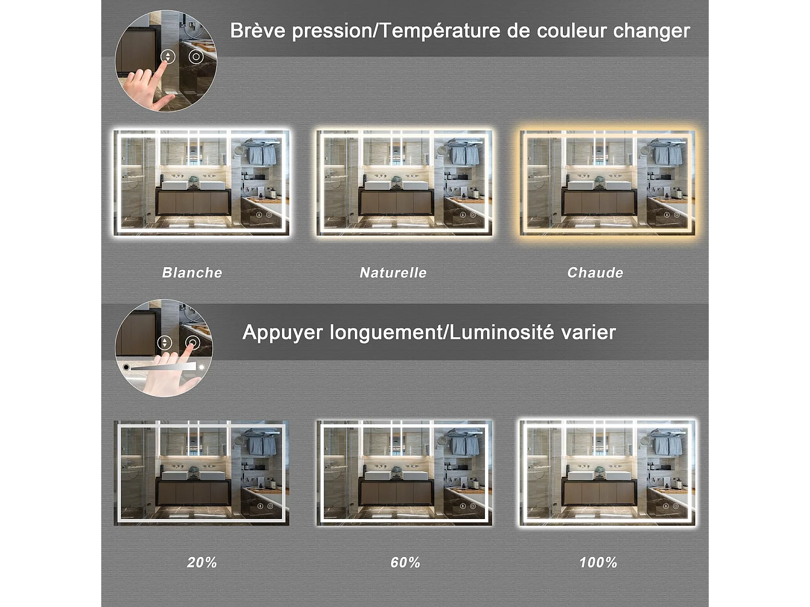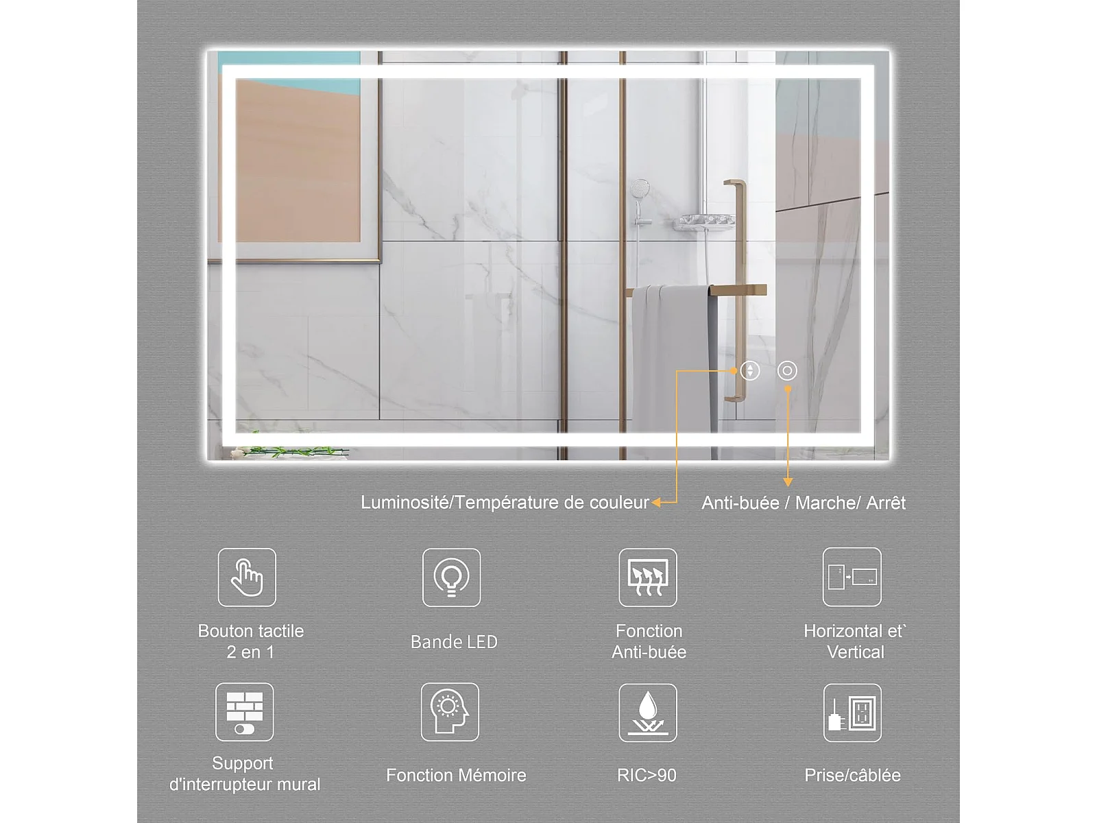 Specchio da bagno 100x60cm LED 30W, antiappannamento, dimmerabile 3 colori, interruttore touch, vetro antideflagrante