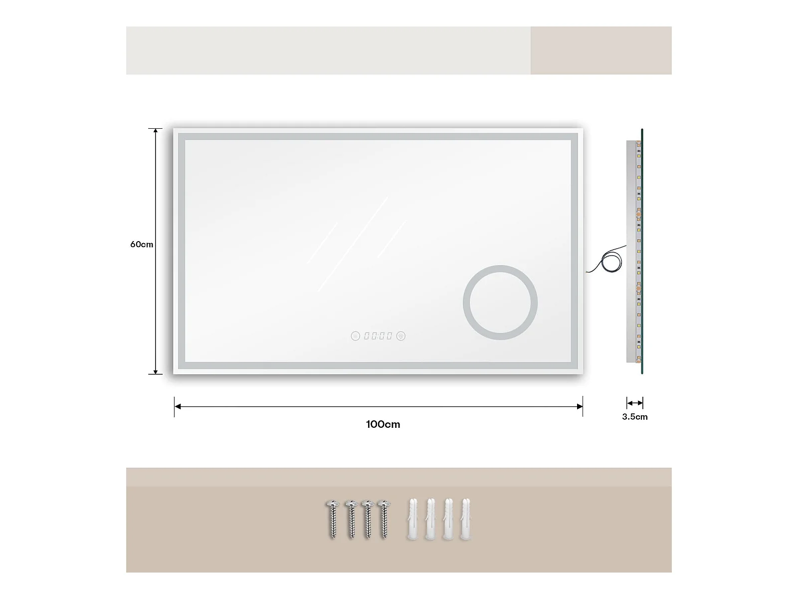 Specchio da bagno 100x60cm LED, antiappannamento, 3 lenti di ingrandimento, orologio, presa per rasoio, dimmerabile 3 colori, IP44