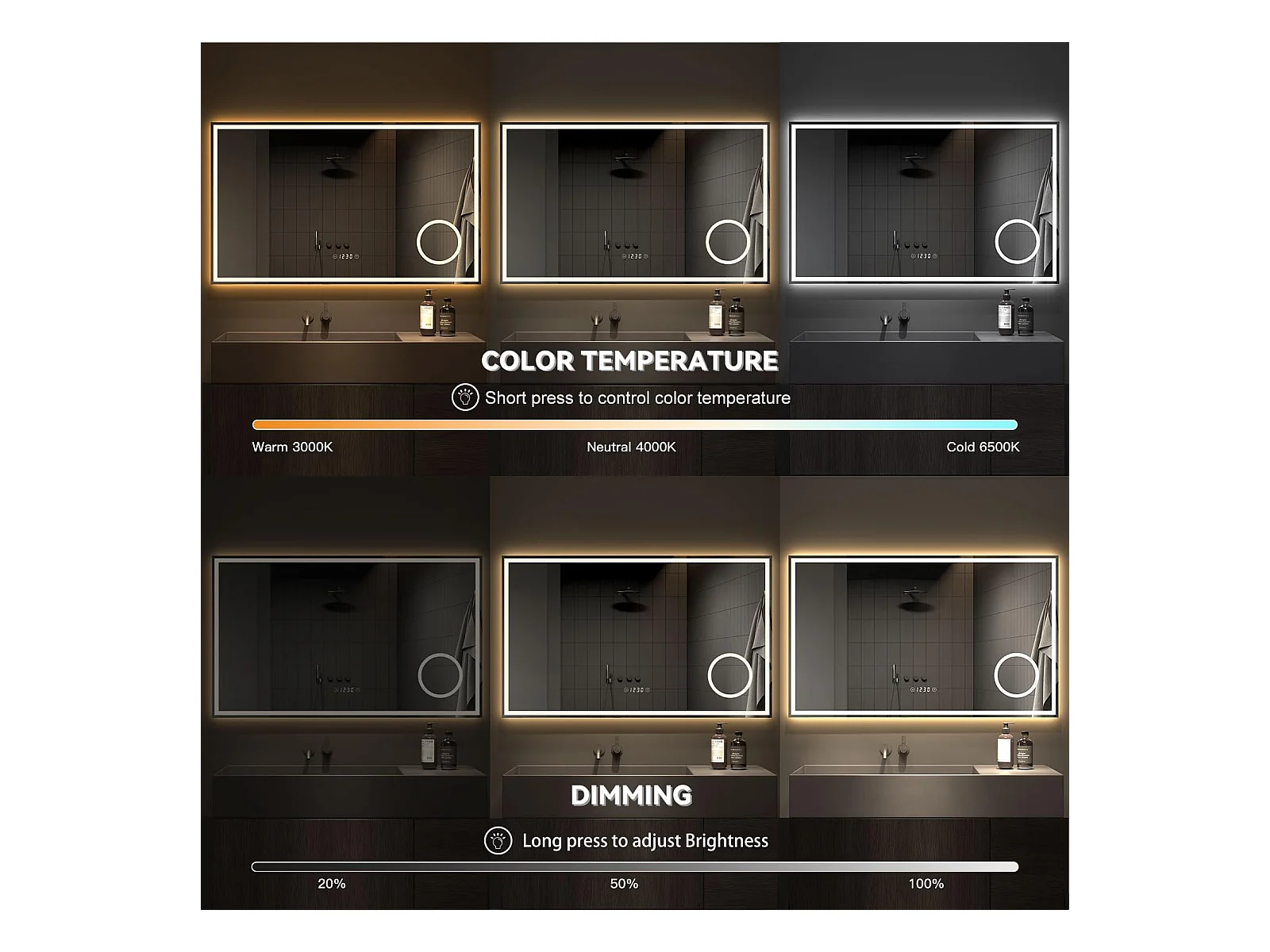 Specchio da bagno 100x60cm LED 30W, antiappannamento, dimmerabile 3 colori, interruttore touch, vetro antideflagrante