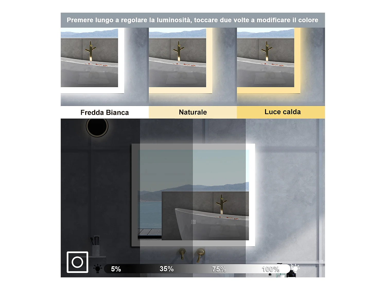 AICA Specchio da bagno 70 x 50 cm, dimmerabile, interruttore touch, Funzione Memoria, antiappannamento, 3 colori