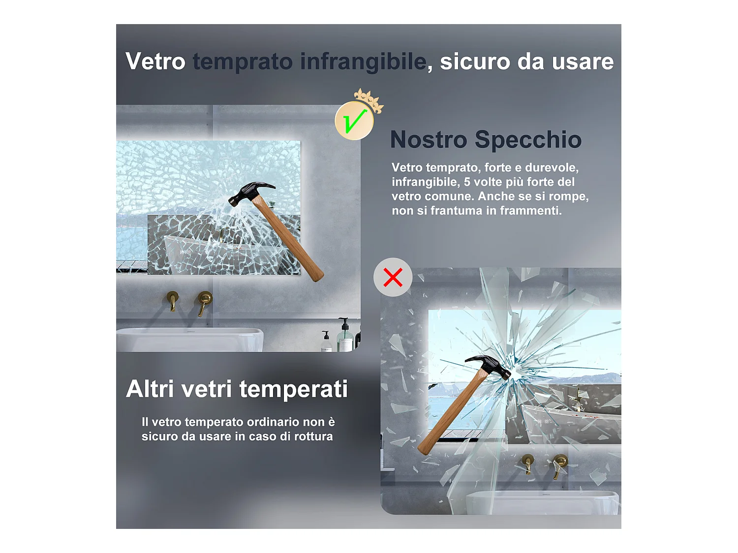 Specchio da bagno Rettangolare con 70x50cm,3 colori,Memoria, Antifog,Regorabile,Retroilluminato,doppio interruttore,