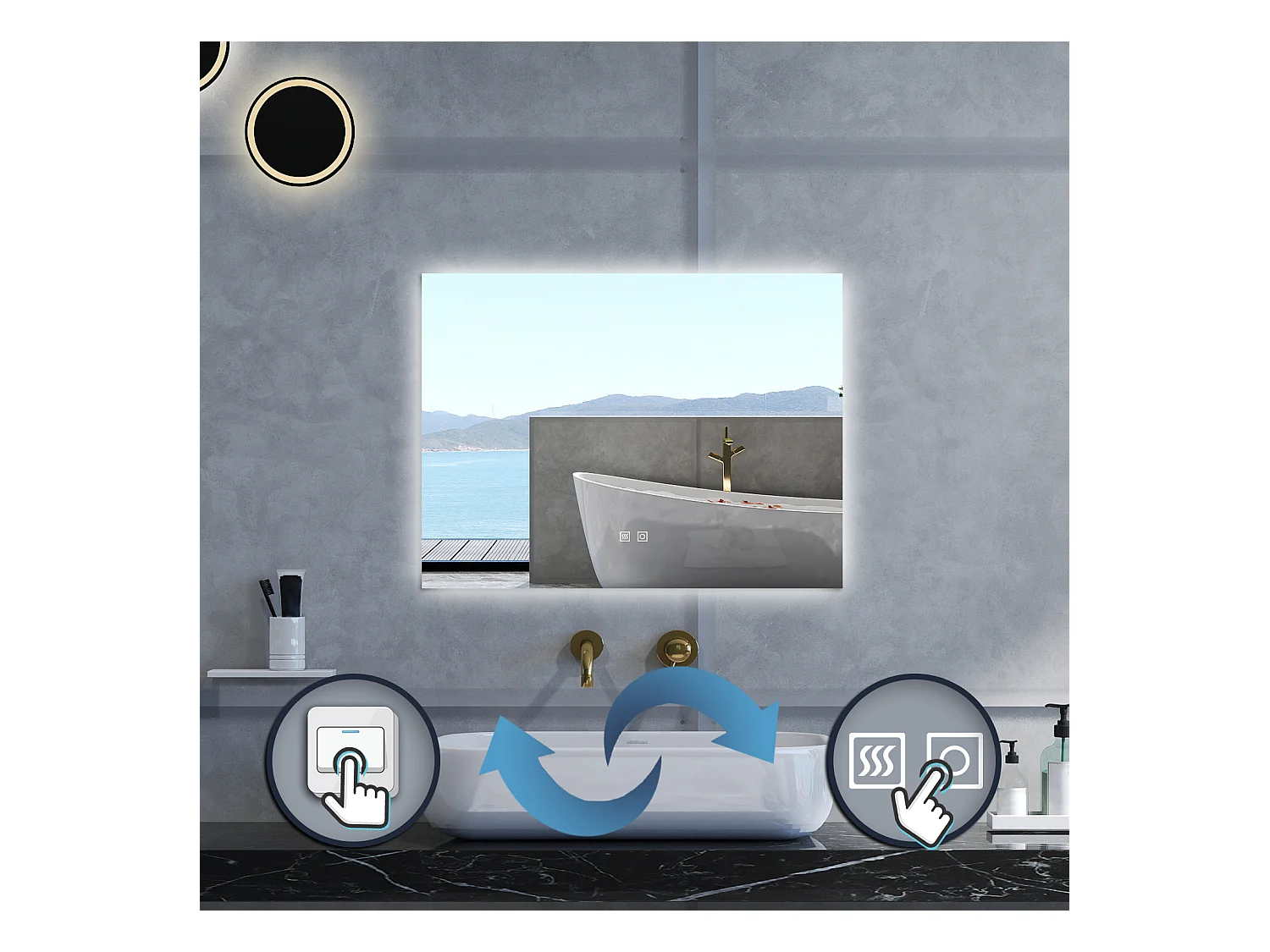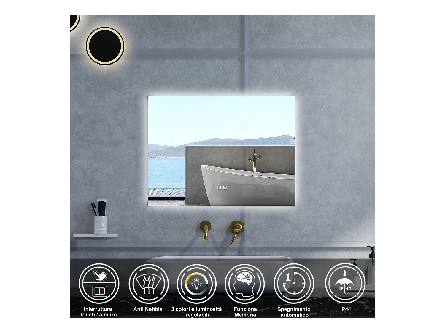 Specchio da bagno Rettangolare con 80x60cm,3 colori,Memoria, Antifog,Regorabile,Retroilluminato,doppio interruttore,