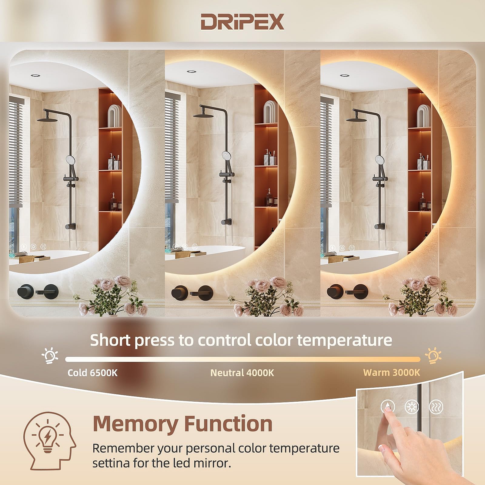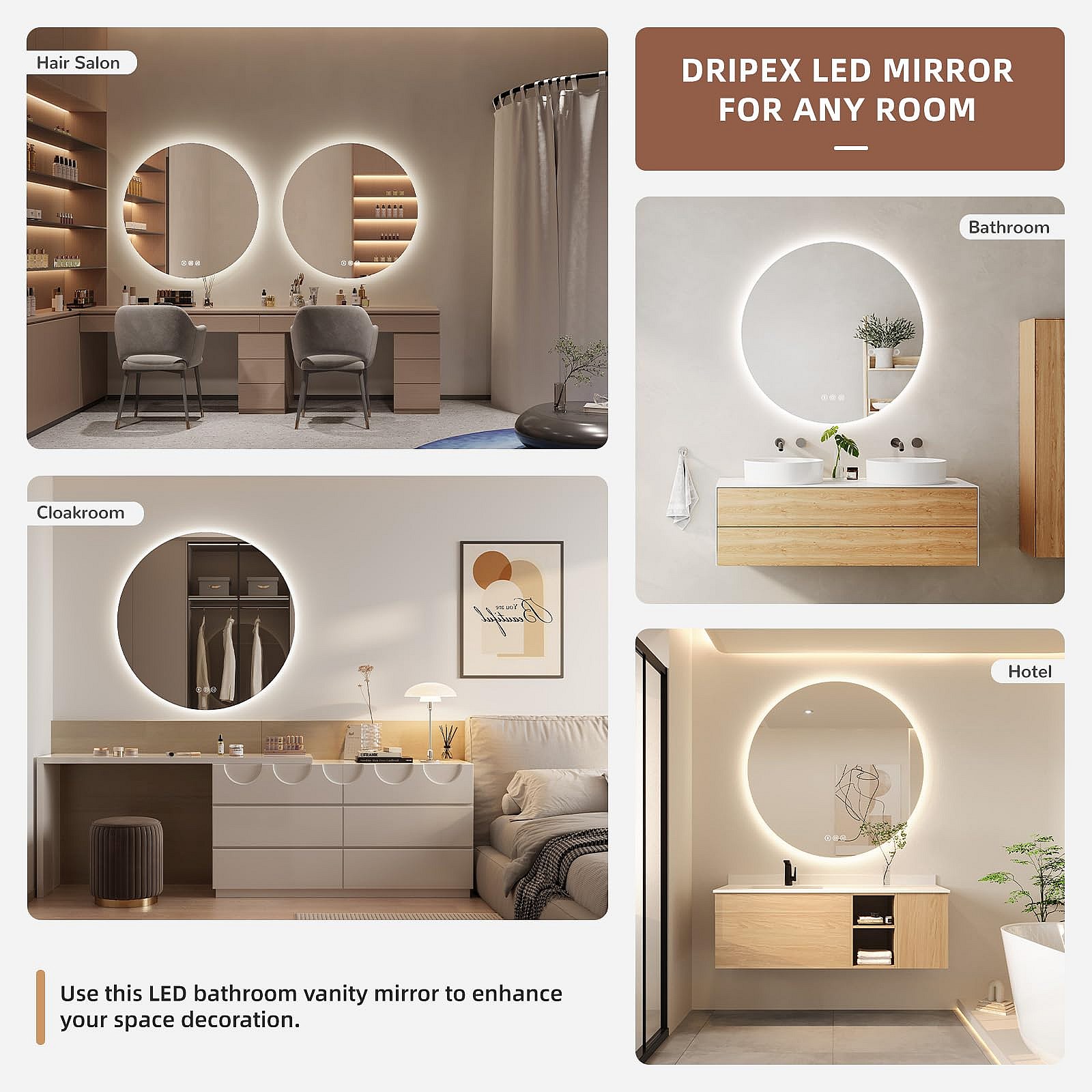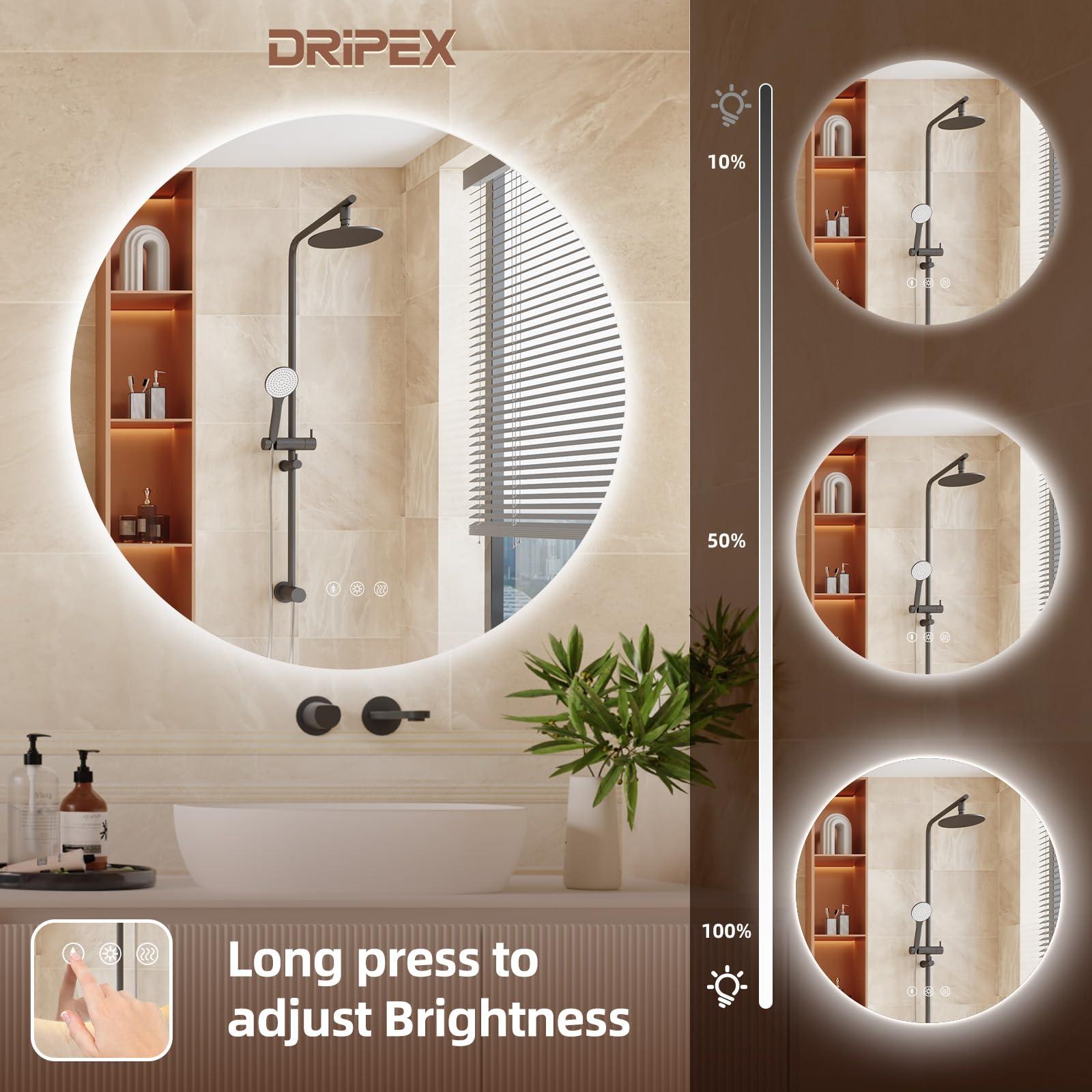 Specchio da bagno rotondo a LED da 50 cm con antiappannamento, 3 colori dimmerabili, memoria, vetro temperato HD, sensore touch, IP44