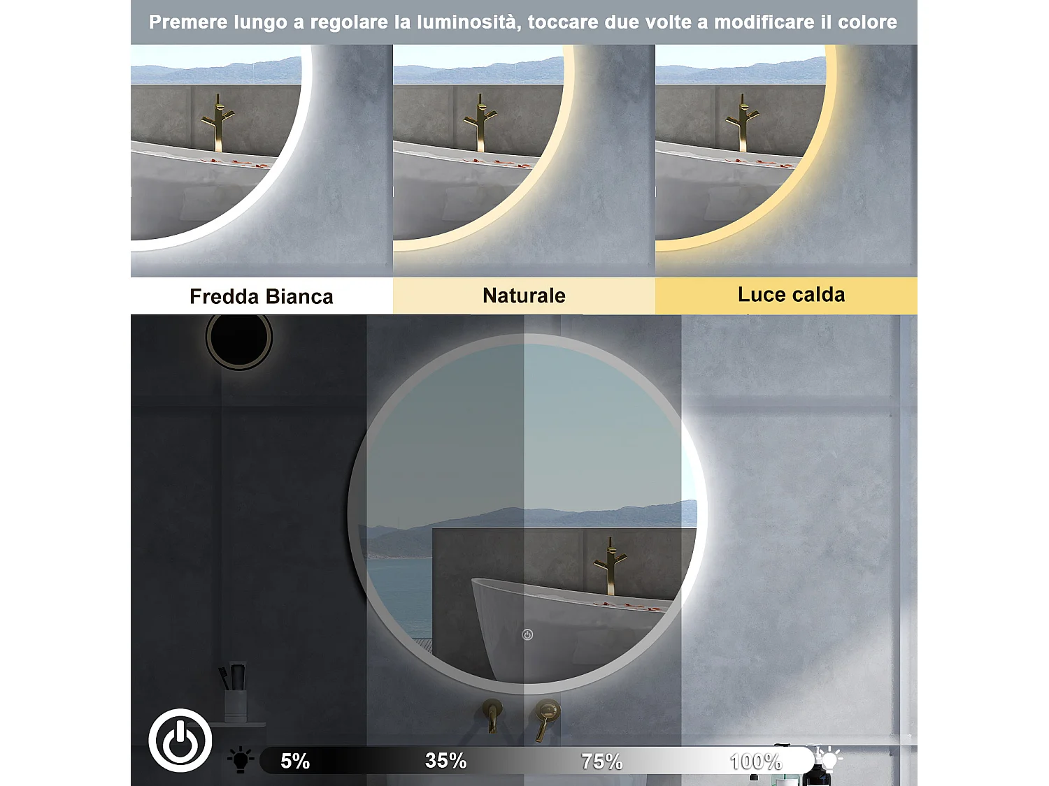 Specchio da bagno Rotondo con 90cm,3 colori,Memoria, Antifog,Regorabile,Retroilluminato,doppio interruttore,