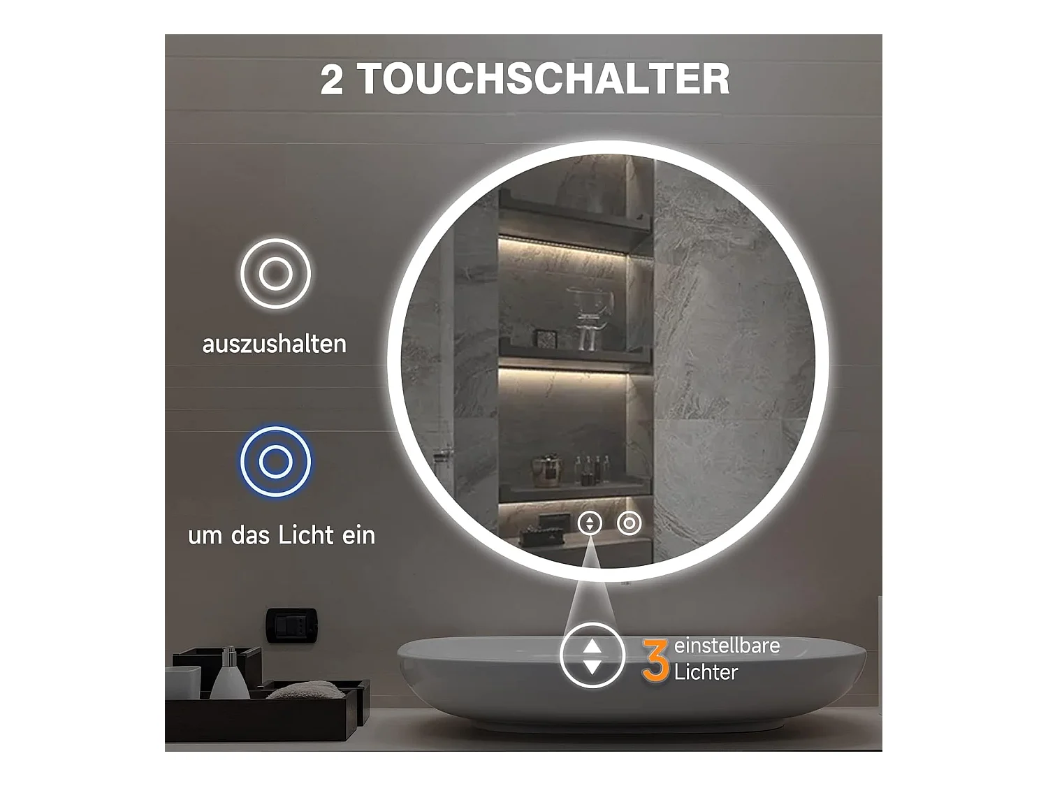 Specchio da bagno rotondo a LED da 60 cm, antiappannamento, 3 colori, dimmerabile, interruttore touch