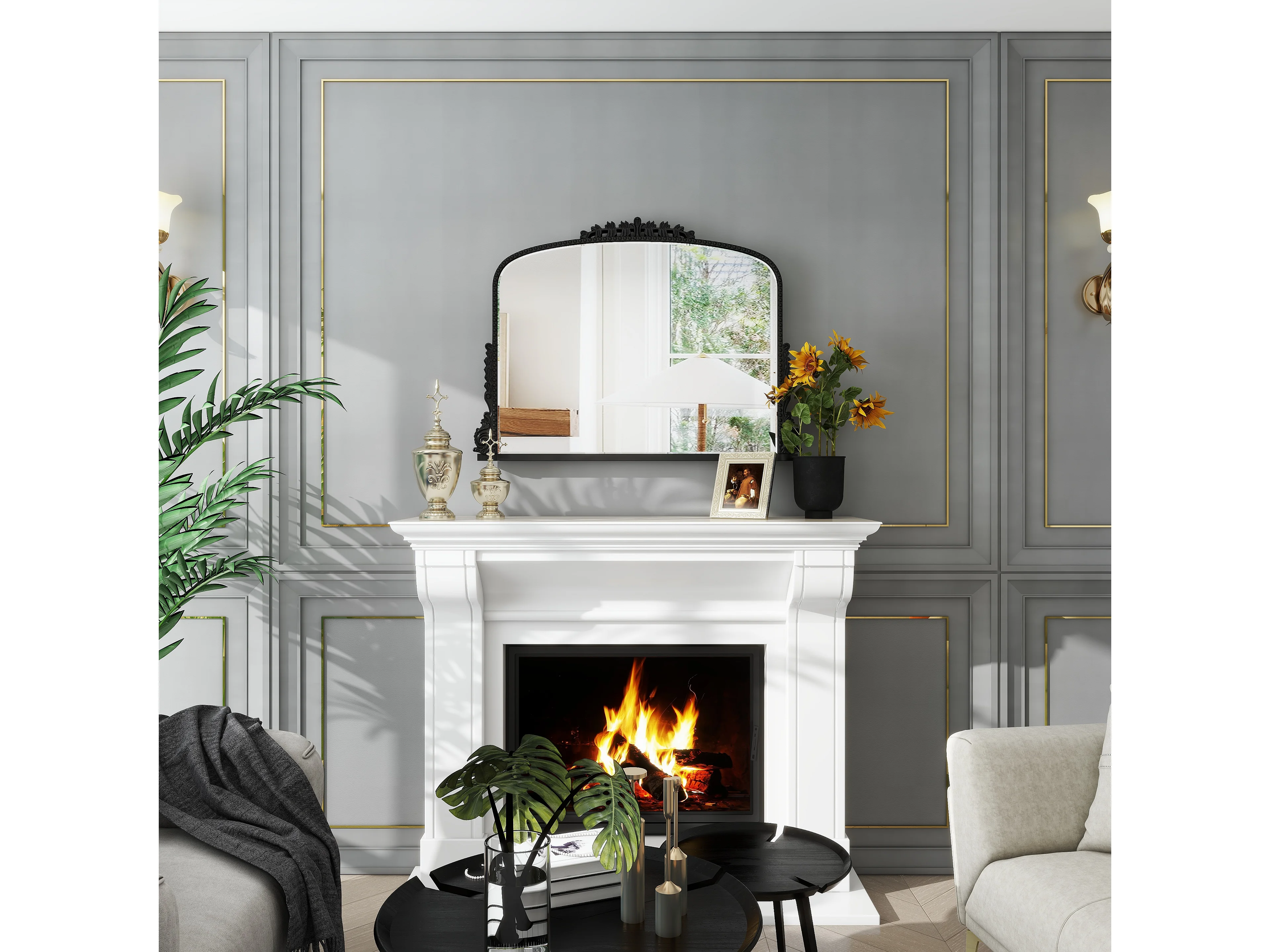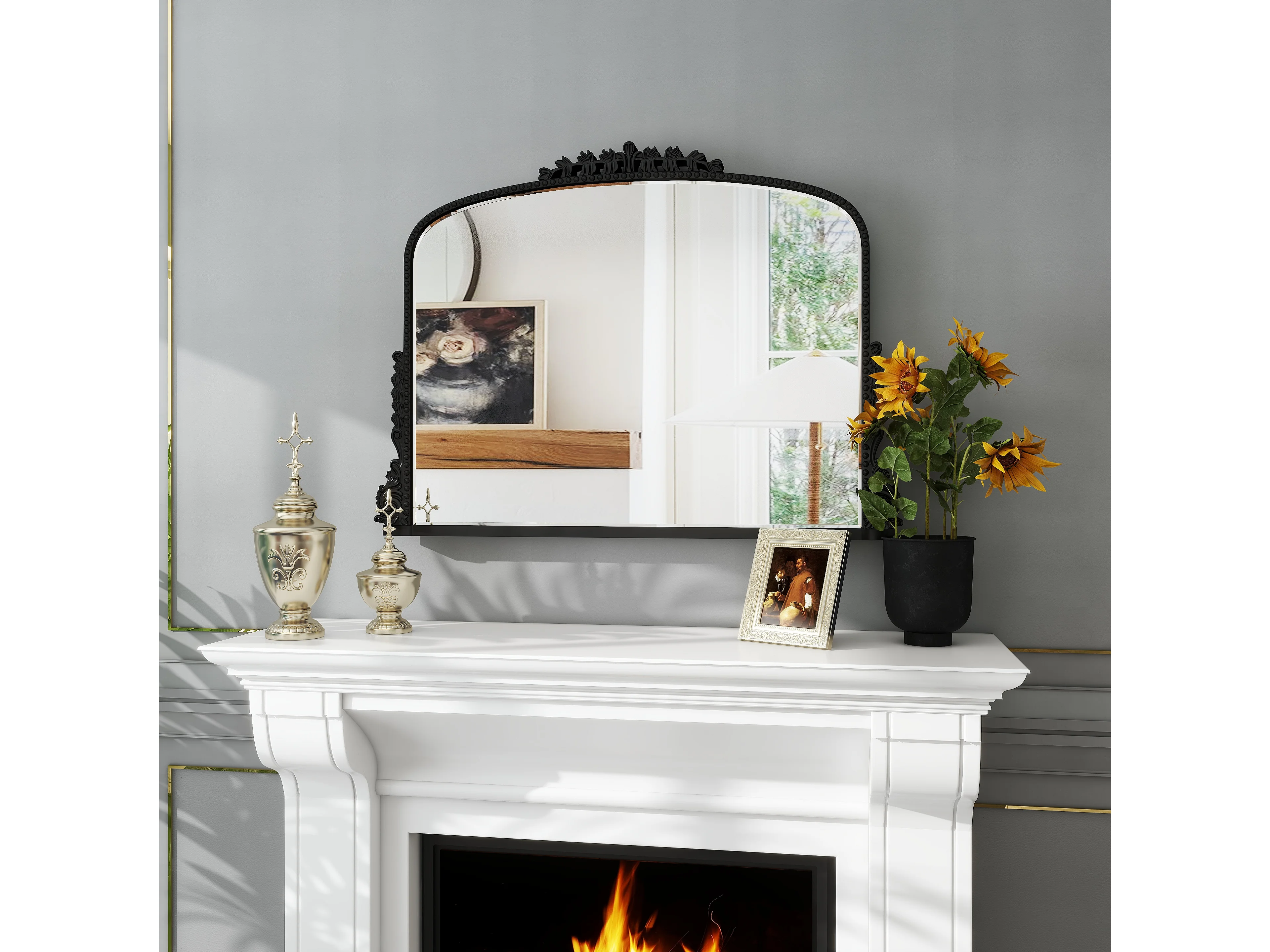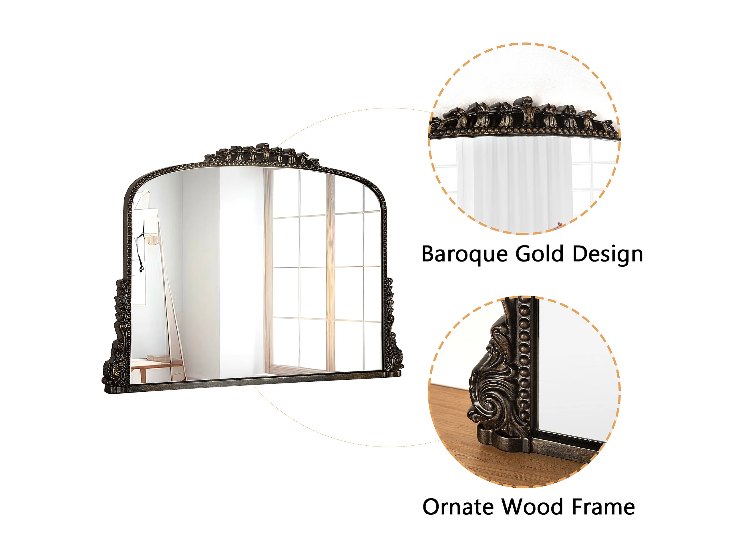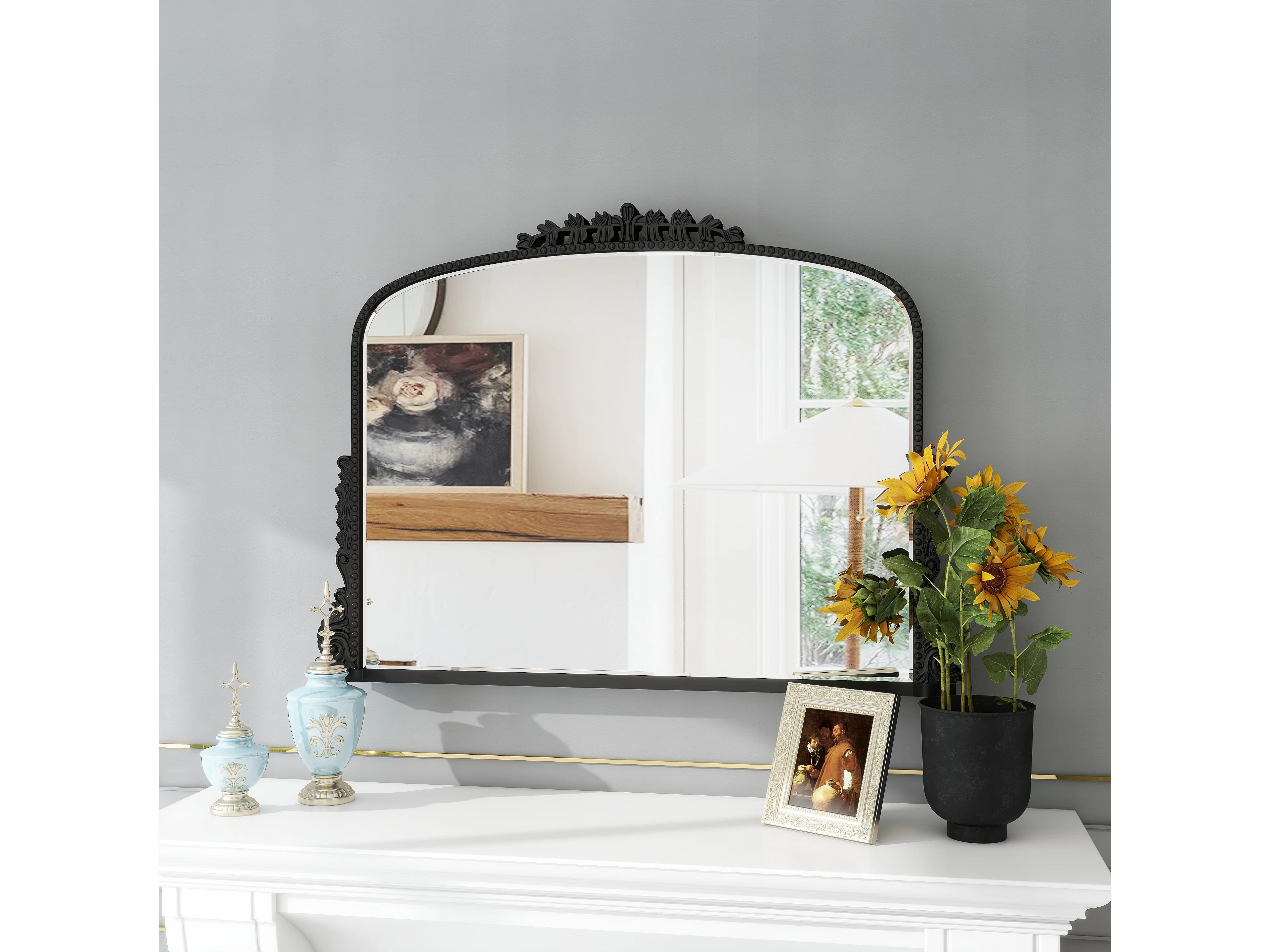 Specchio da parete ad arco vintage, cornice in resina decorata, design barocco, nero (89x5,2x65,8 cm)