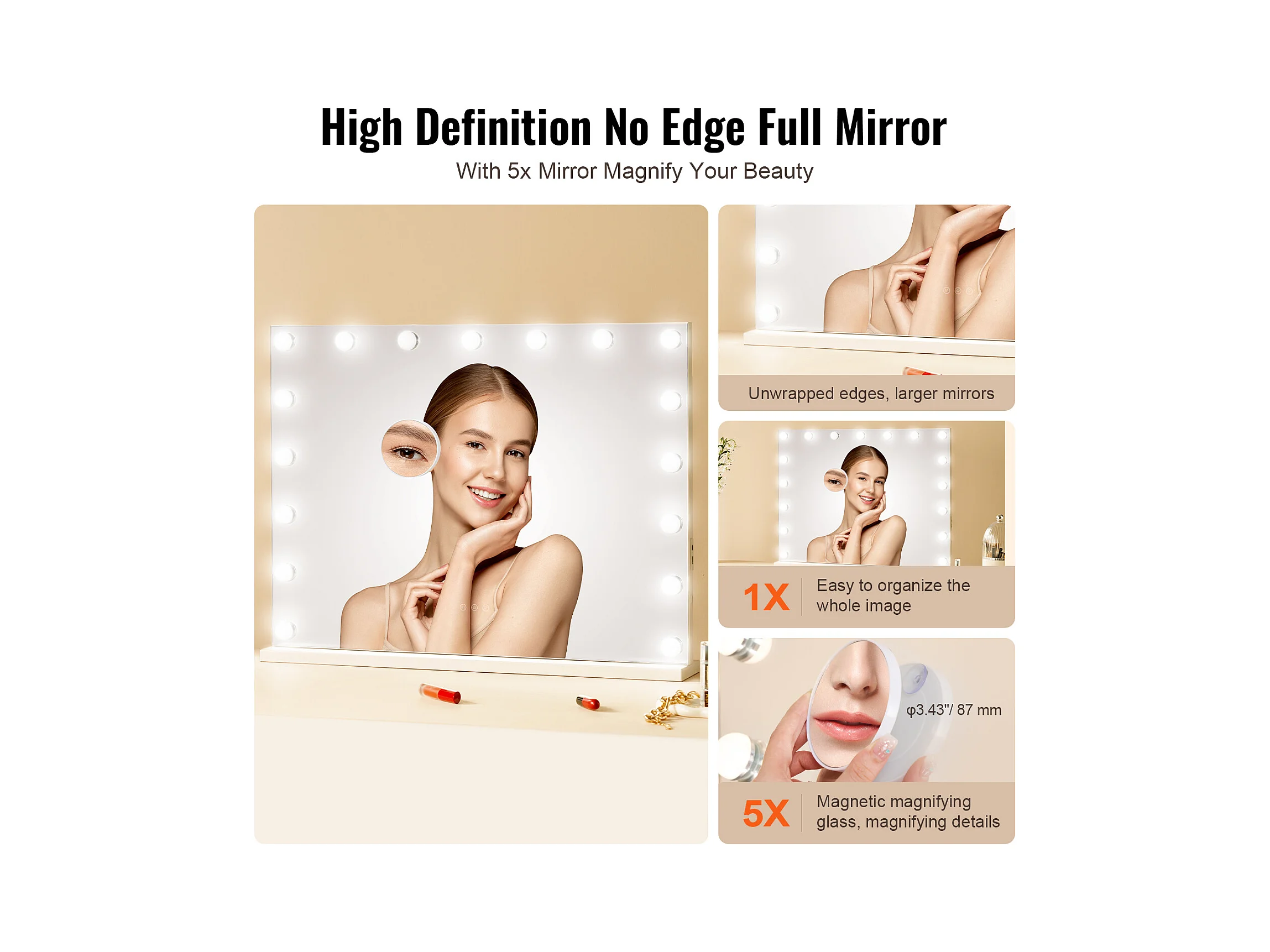 Specchio da trucco SucceBuy 58 x 46 cm, Bianco, Specchio di cortesia in stile Hollywood con Luci