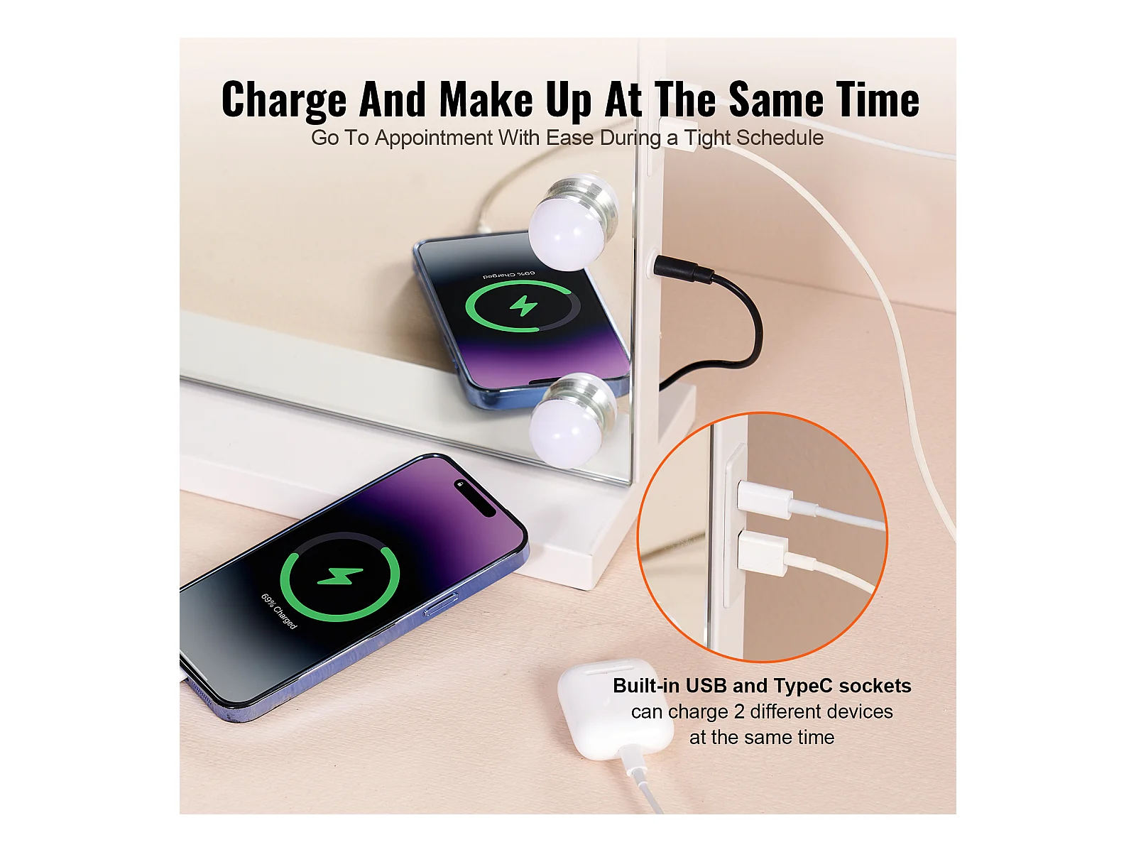 Specchio da Toilette Stile Hollywood SucceBuy, Luminoso Lampade LED Variabili, 3 Modalità di Illuminazione a Colore, 797x597 mm, USB, Tipo C