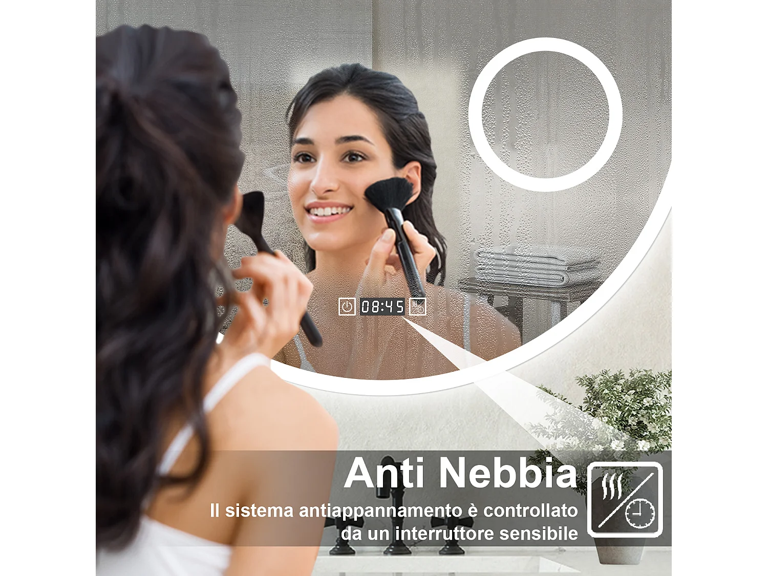 Specchio LED da Bagno Tondo 80cm con 3 Luci, Touch, Orologio, Lente d'Ingrandimento, Anti-Appannamento, Dimmerabile e Memoria