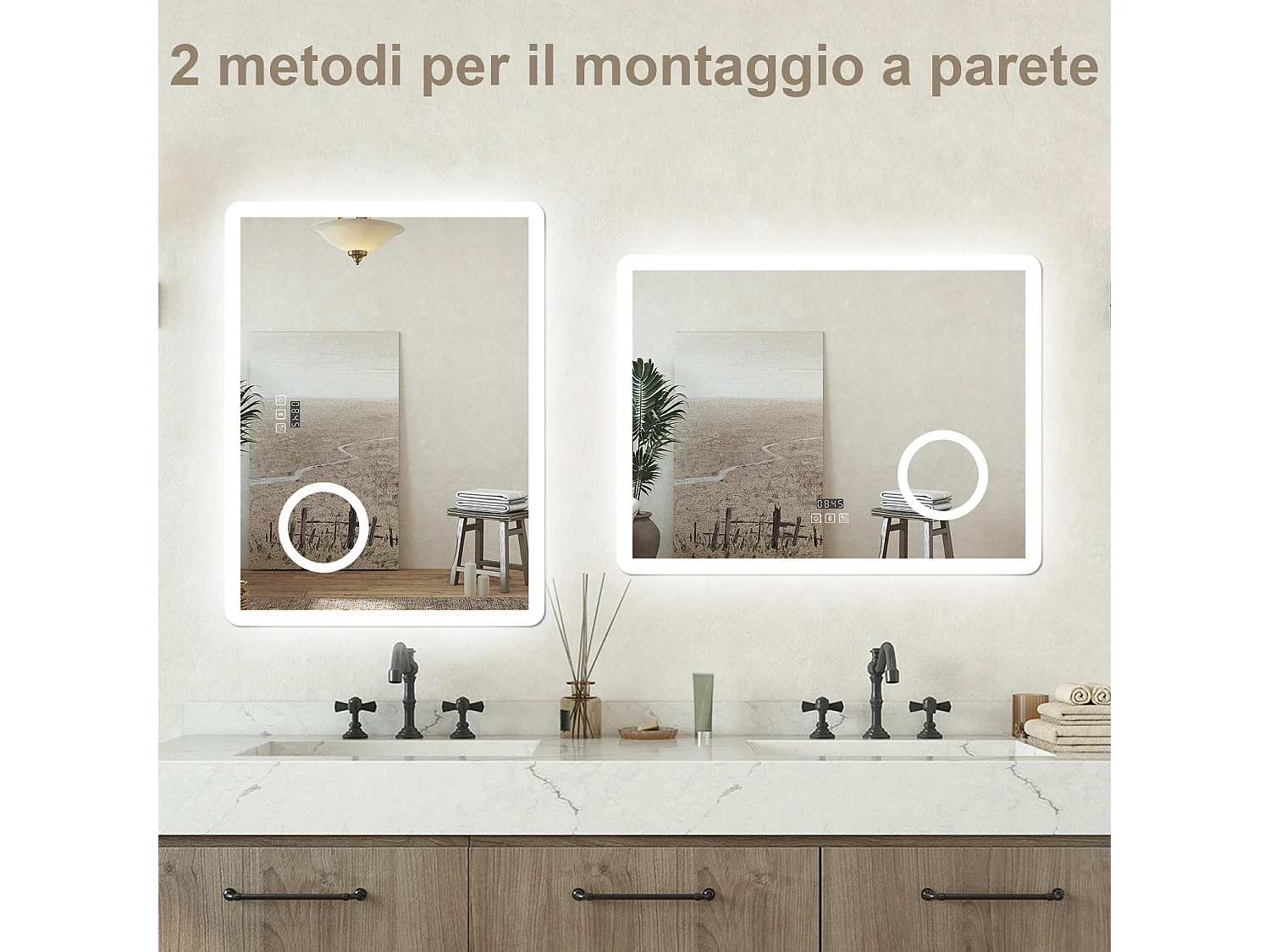 Specchio luminoso Orologio + lente d'ingrandimento + bluetooth + luce tricolore + anti-appannamento 80x60cm bagno regolabile, memoria, touch, LED