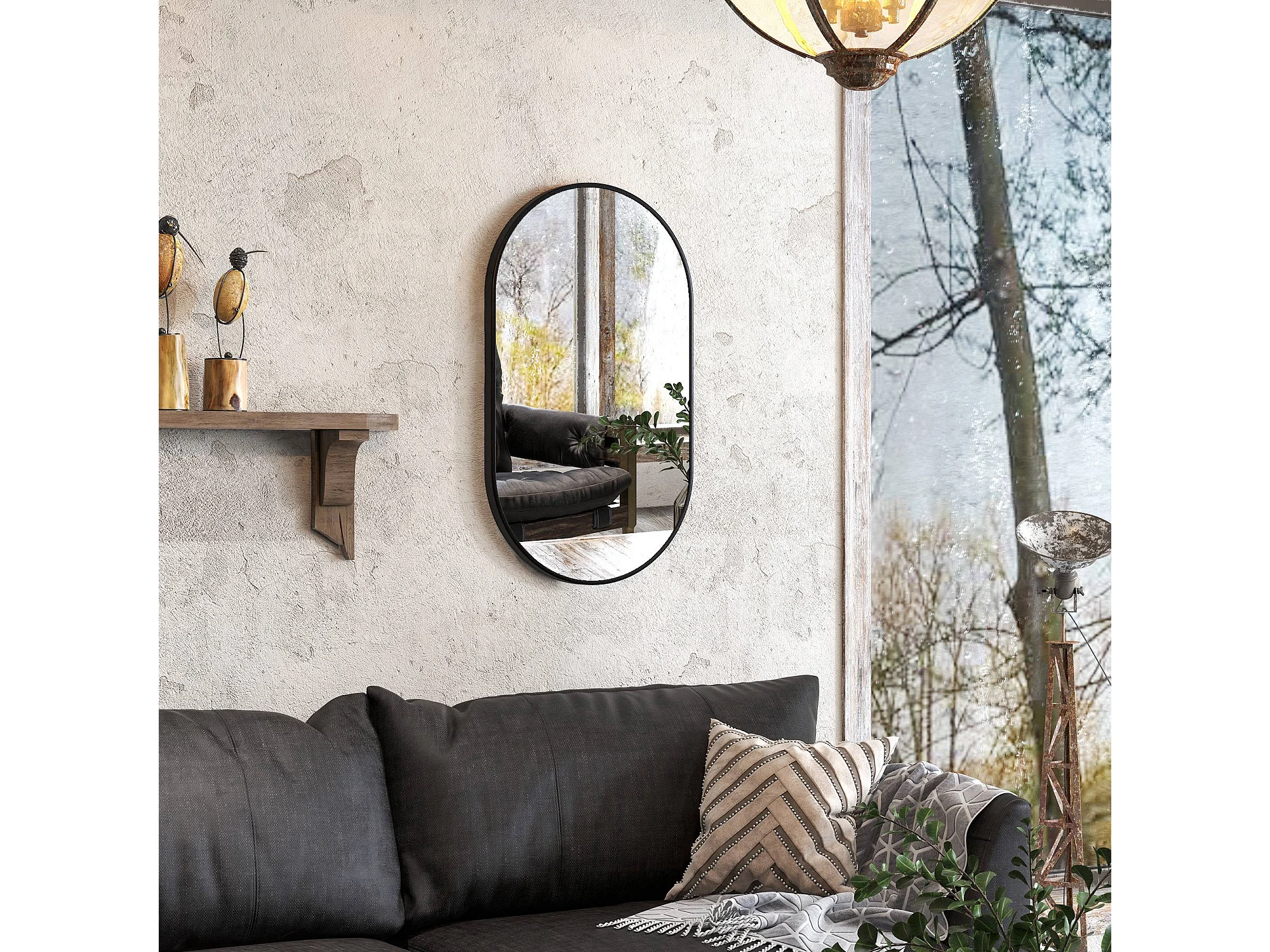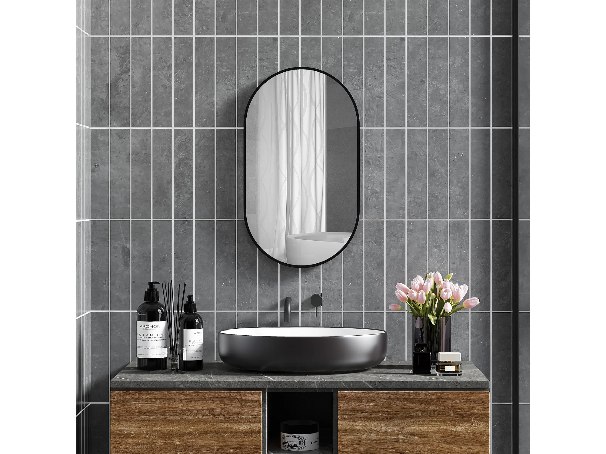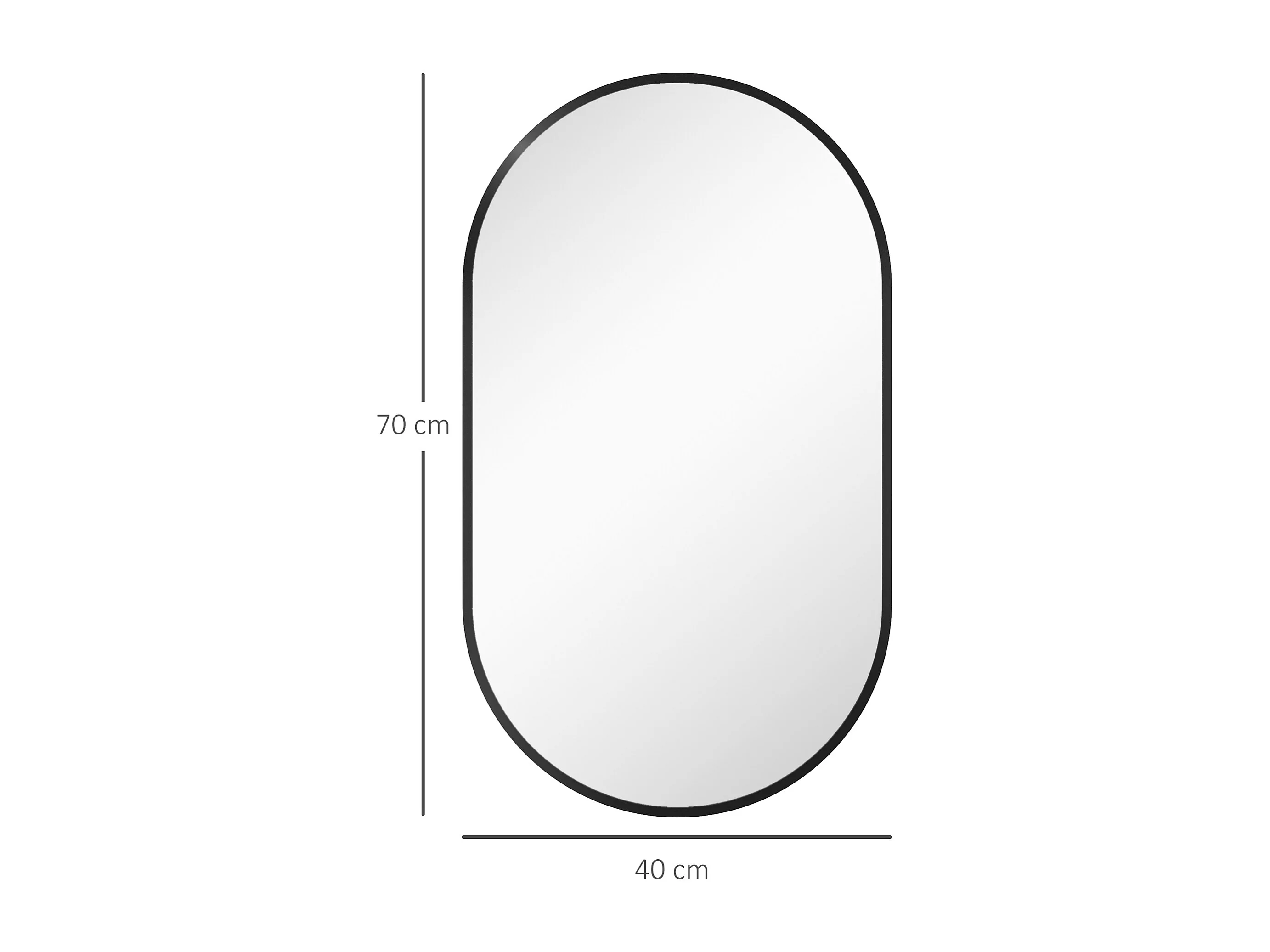 Specchio per bagno ovale con 3 ganci in lega di alluminio e vetro nero