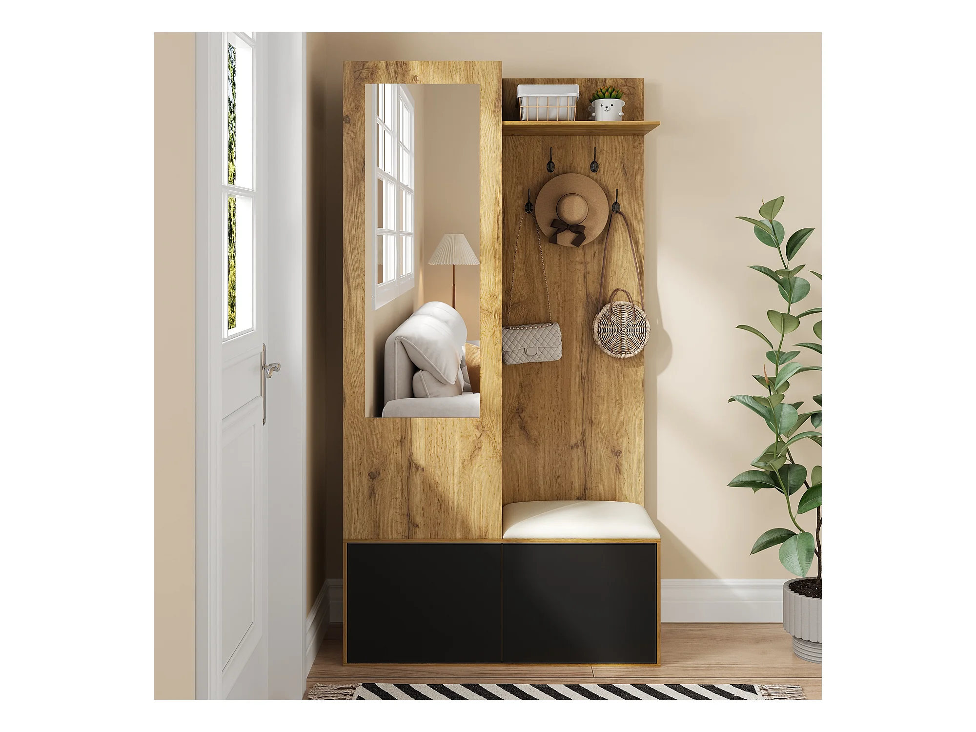 Spogliatoio con specchio - 100 x 38 x 191 cm - con scarpiera + armadio + 2 ante + panca - MDF - naturale