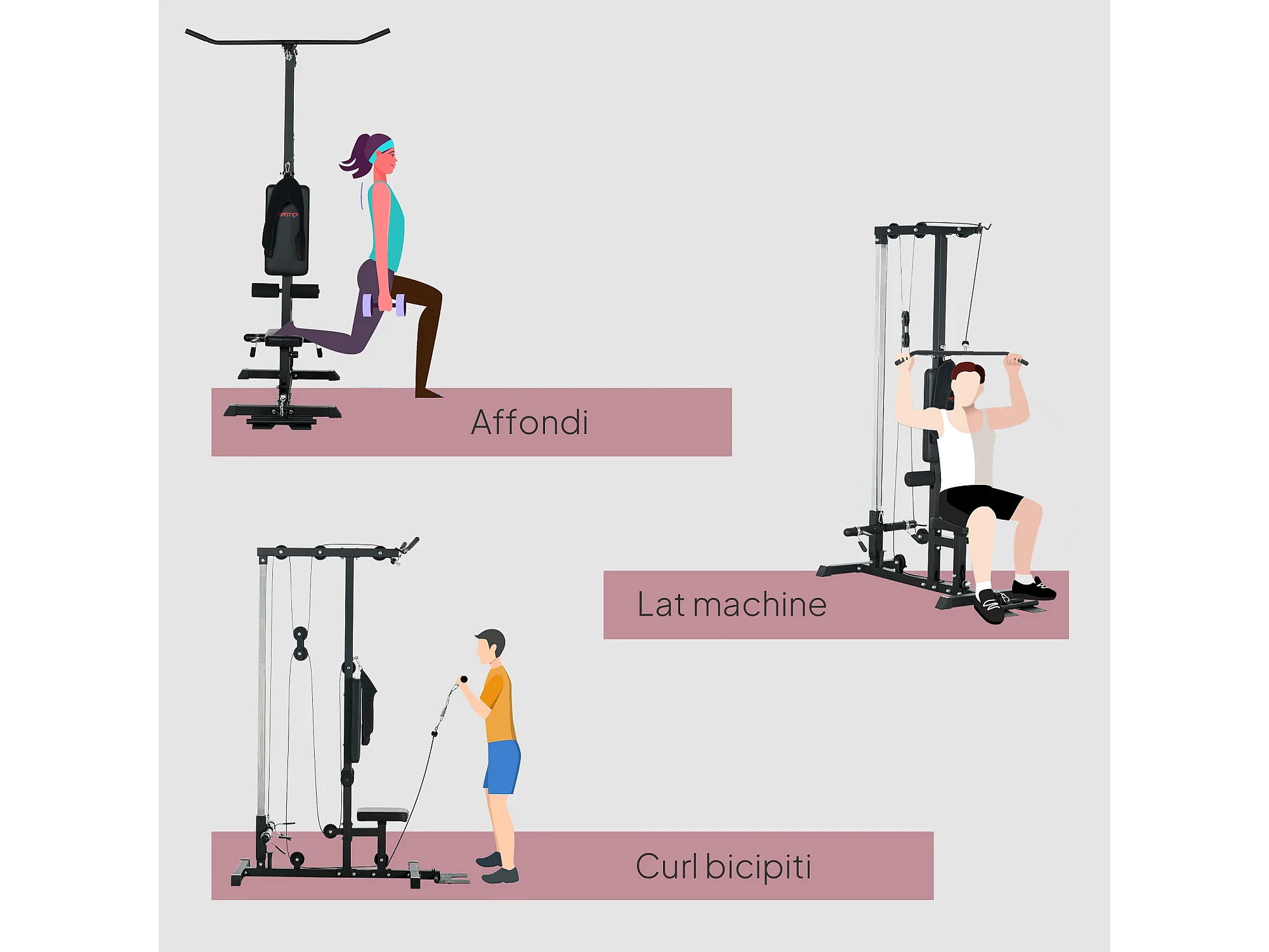 Stazione fitness multifunzione con lat machine in acciaio nero