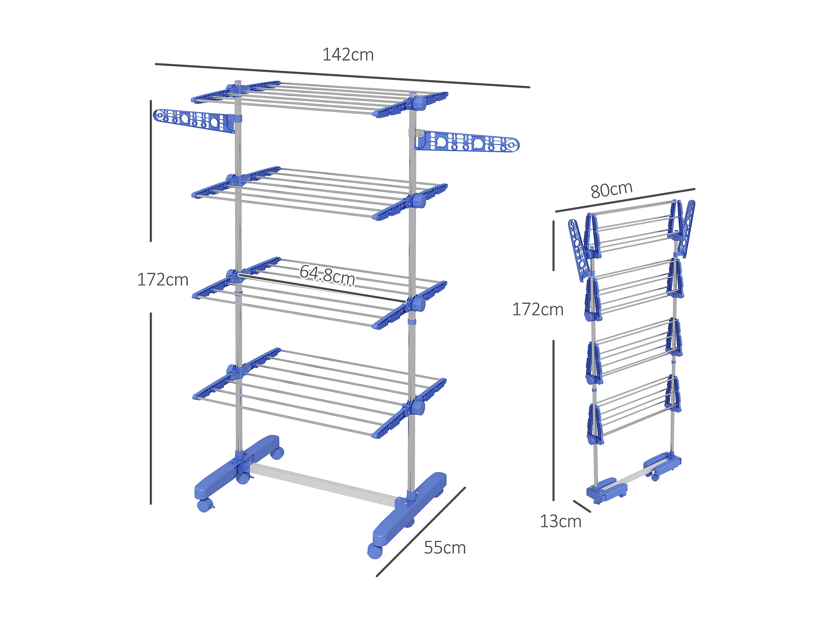 Stendibiancheria A Rotelle Stendino A Torre Verticale In Acciaio E ABS 4 Piani Ripiani Pieghevole Salvaspazio Biancheria Interno Esterno 169 x 75.5 x 63.5 Cm (Blu)