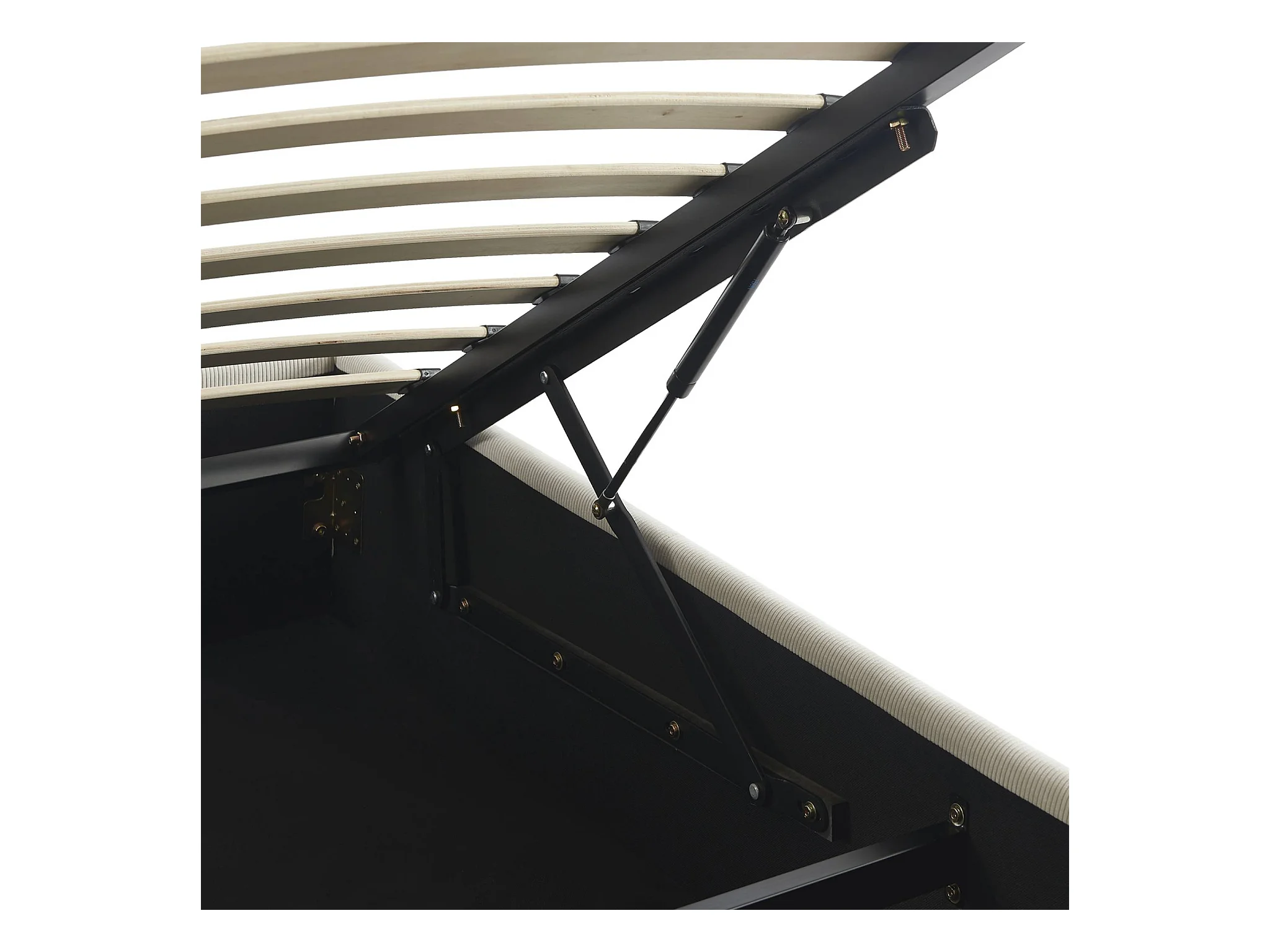 Struttura letto con contenitore e rete a doghe, imbottita bouclé
