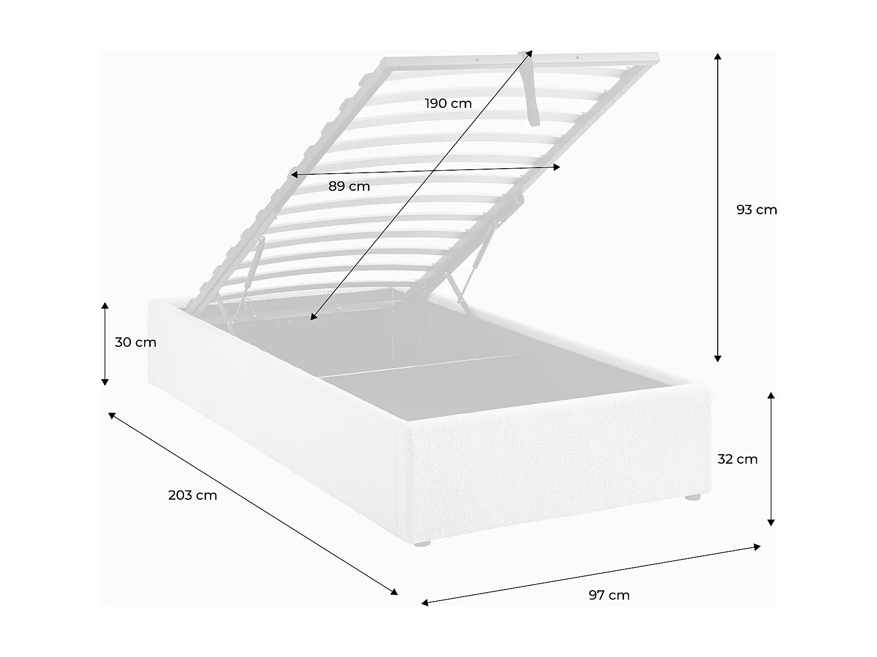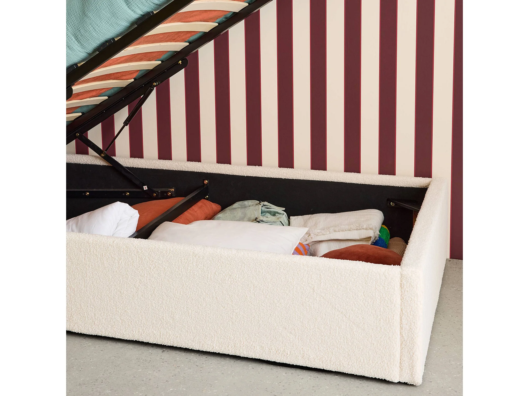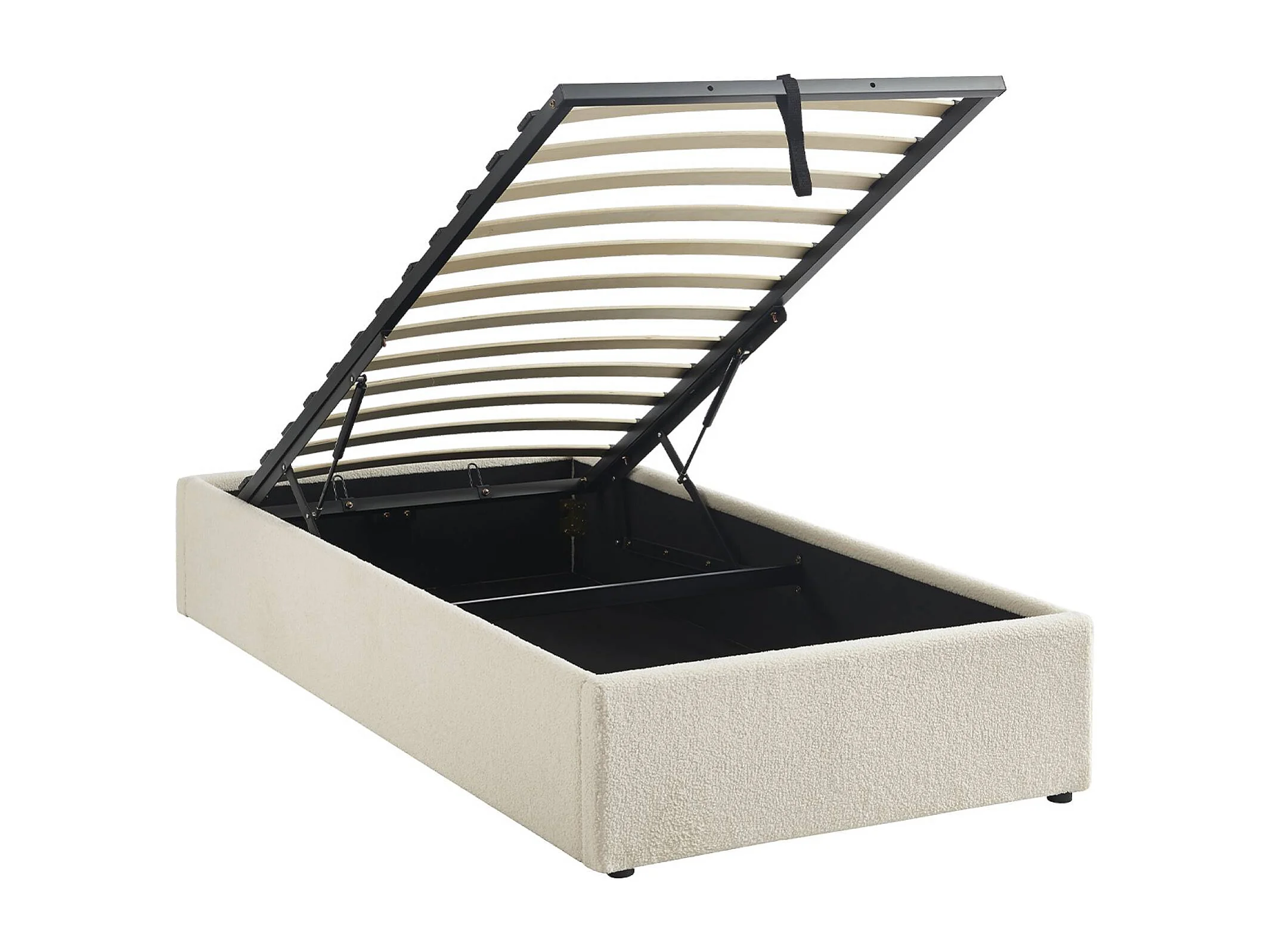Struttura letto con contenitore e rete a doghe, imbottita bouclé