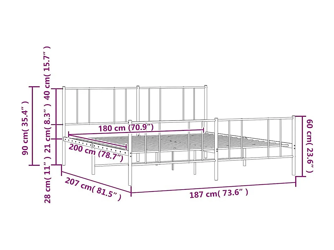 Struttura letto in metallo senza materasso con pediera nera 180x200cm