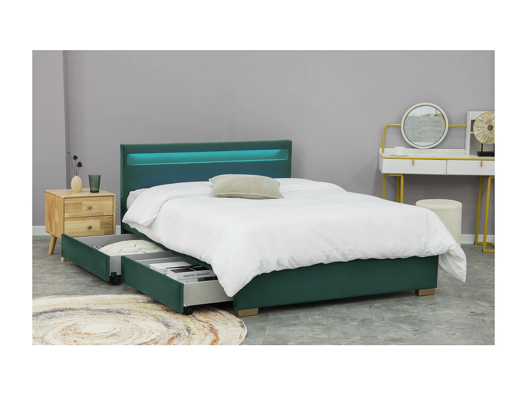 Struttura letto in velluto verde con contenitore e LED integrati 140x190 ENFIELD