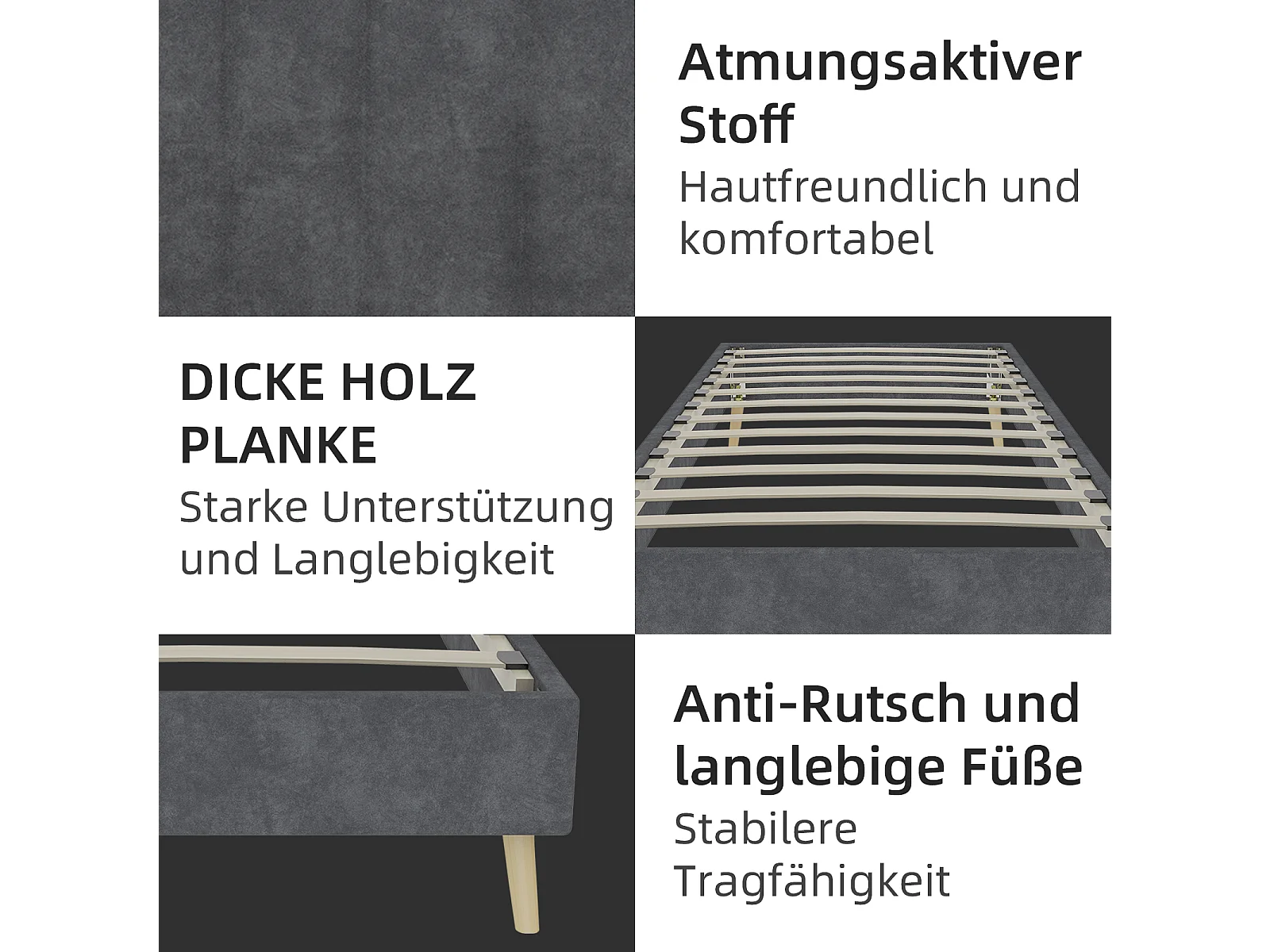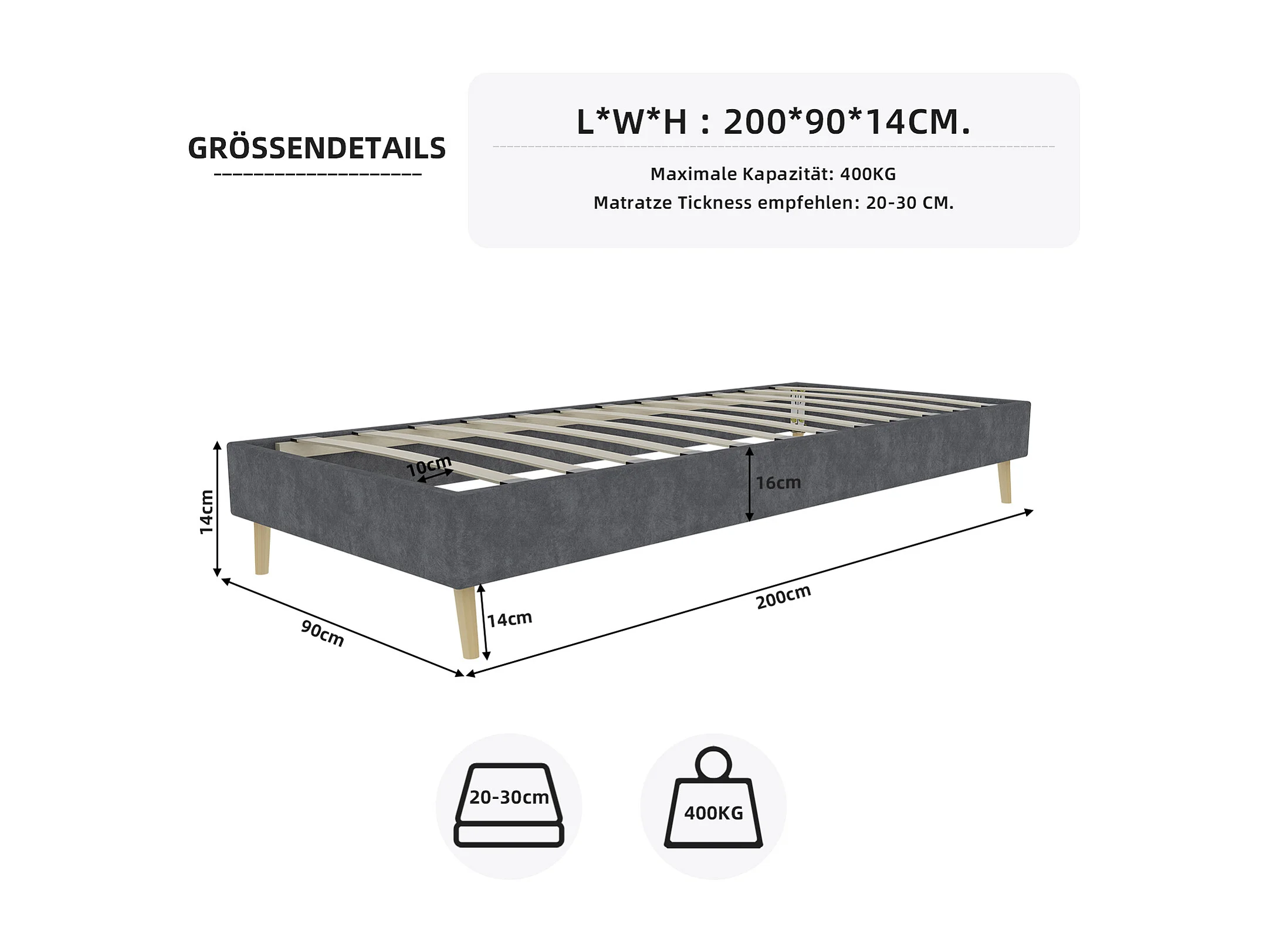 Struttura letto minimalista 90x200 cm in velluto grigio, base bassa, arredamento moderno – senza meccanismo a molla a gas, testiera e materasso
