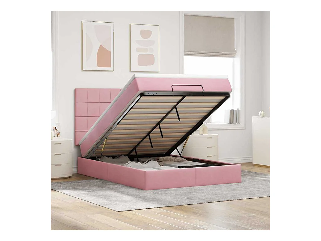 Letto matrimoniale 140x200cm, struttura flottante con LED, rivestimento in velluto rosa, testiera design (210x151x122cm)