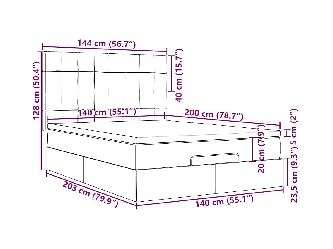 Letto imbottito MALIBU, testiera, rivestimento MONOLITH, box contenitore con pistone a gas, altezza letto 39 cm, 140x200 cm, Rosa