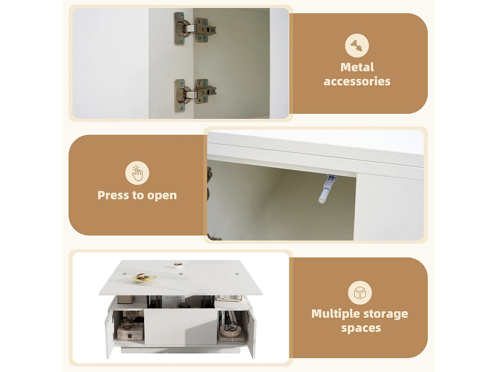 Tavolino moderno con doppio meccanismo di sollevamento, contenitore nascosto, truciolare, bianco (100x50x43 cm)