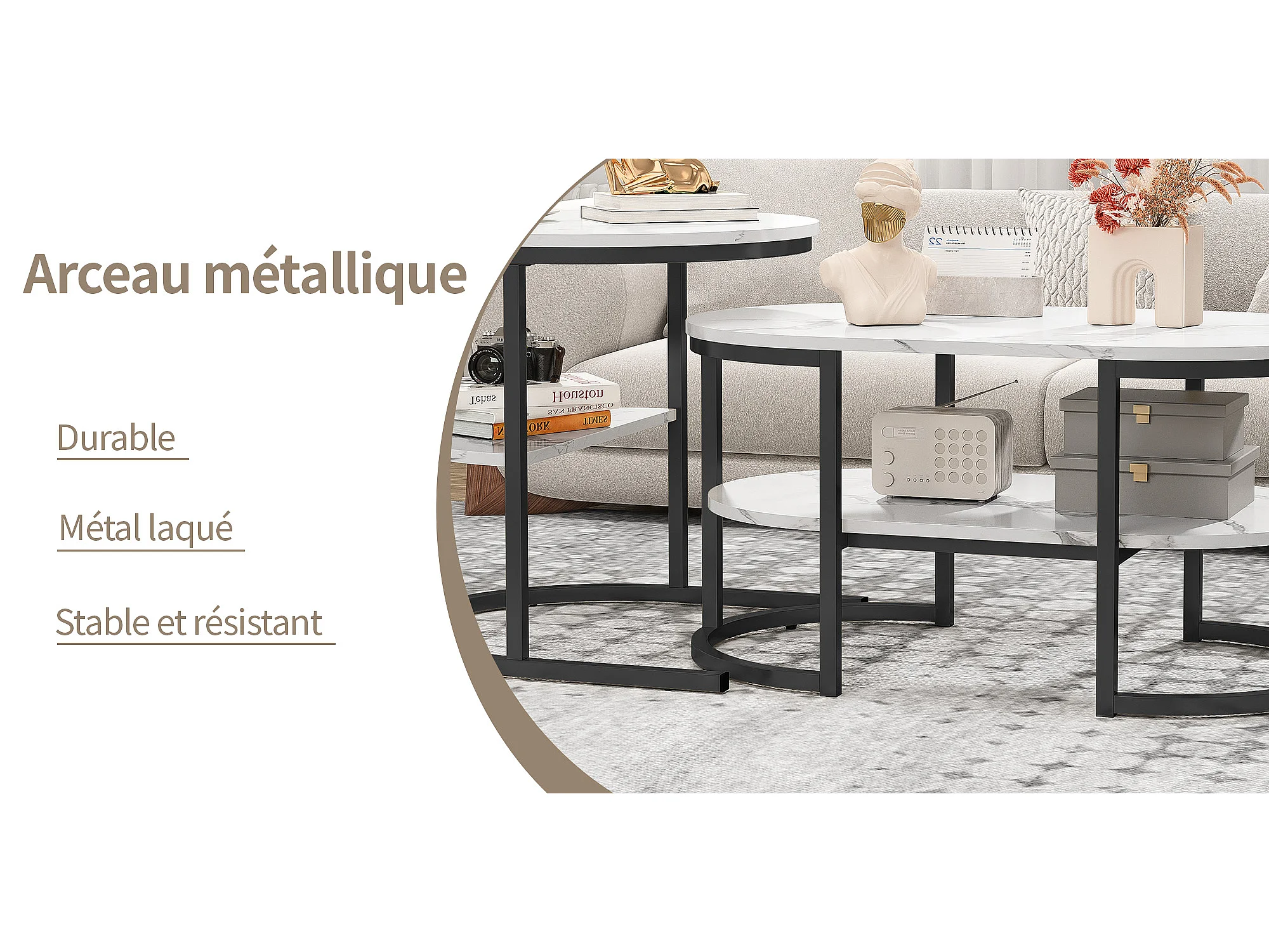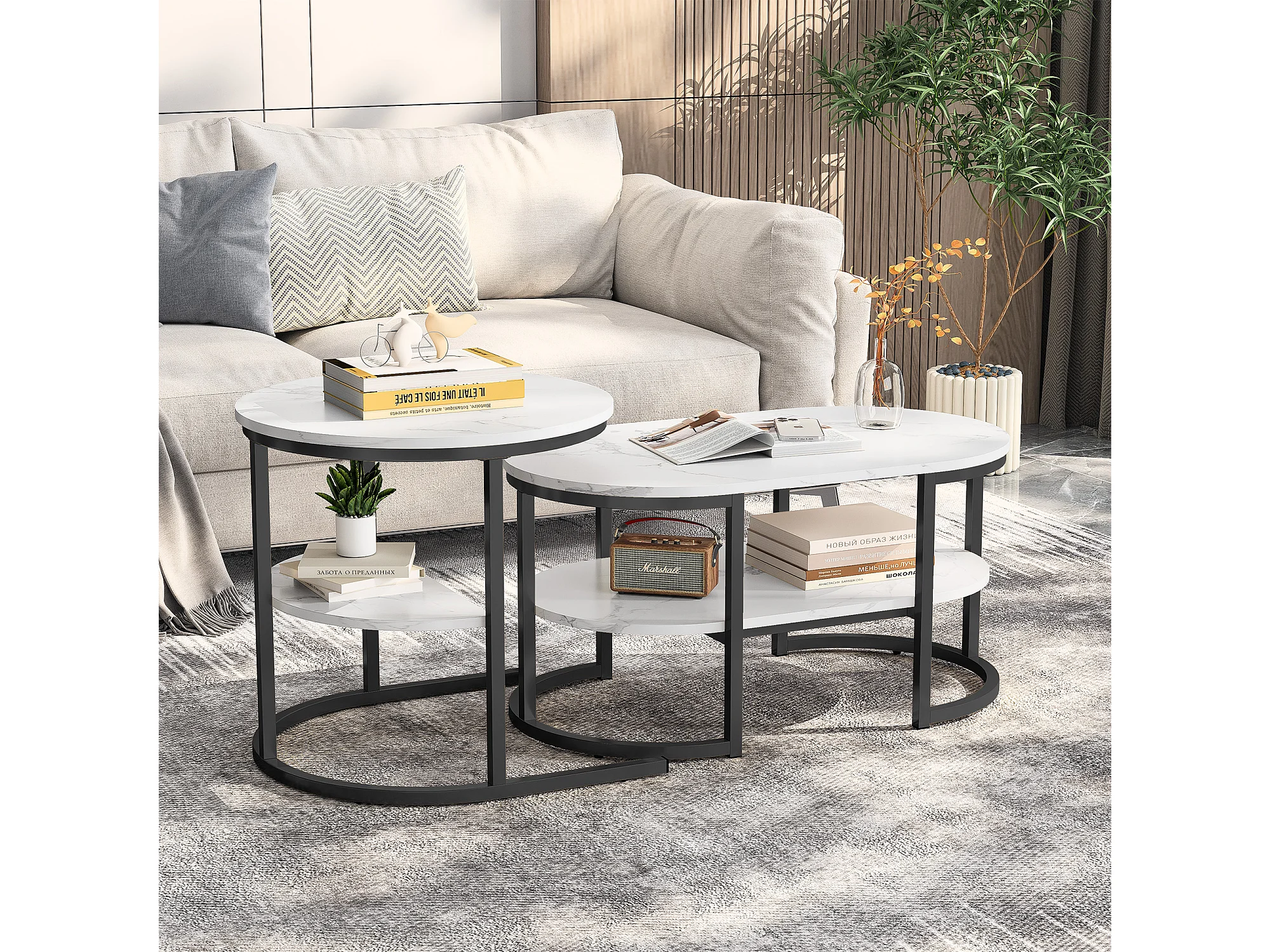Tavolini da caffè ovali e rotondi impilabili in effetto marmo bianco con struttura nera, che creano un design moderno ed elegante