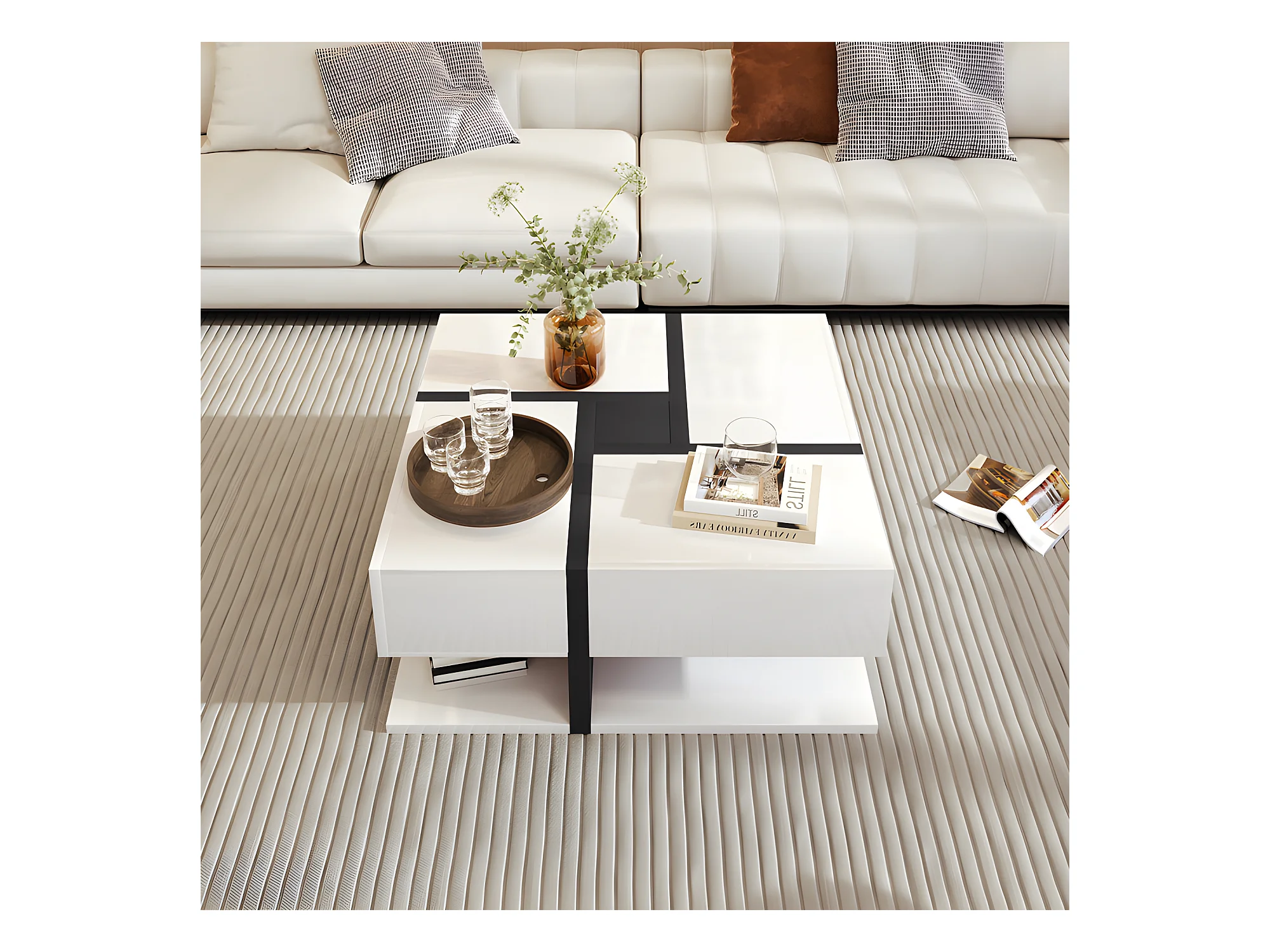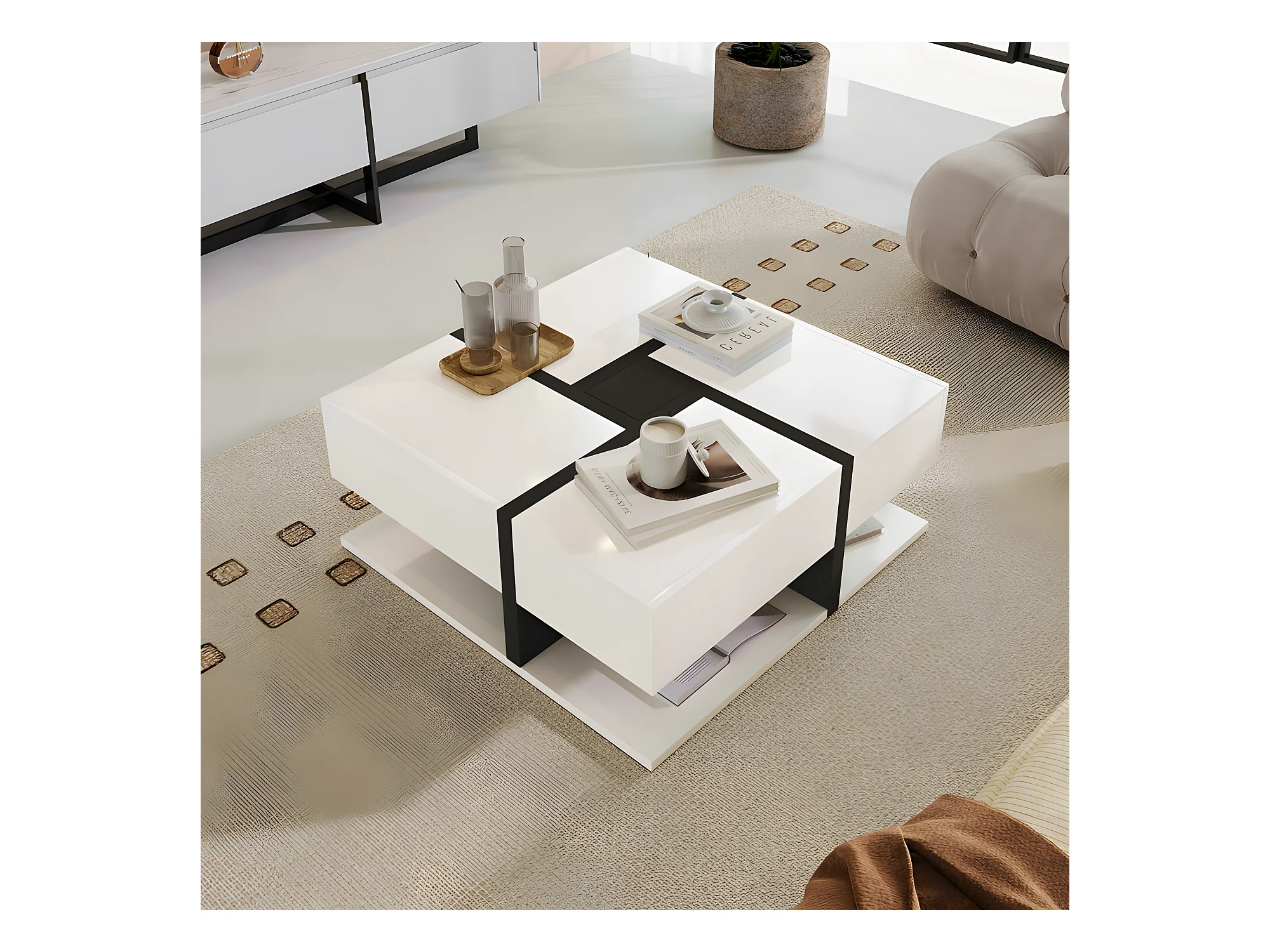 Tavolino con contenitore 70x70x36 cm - piano lucido ruotabile a 360° - Bianco e Nero
