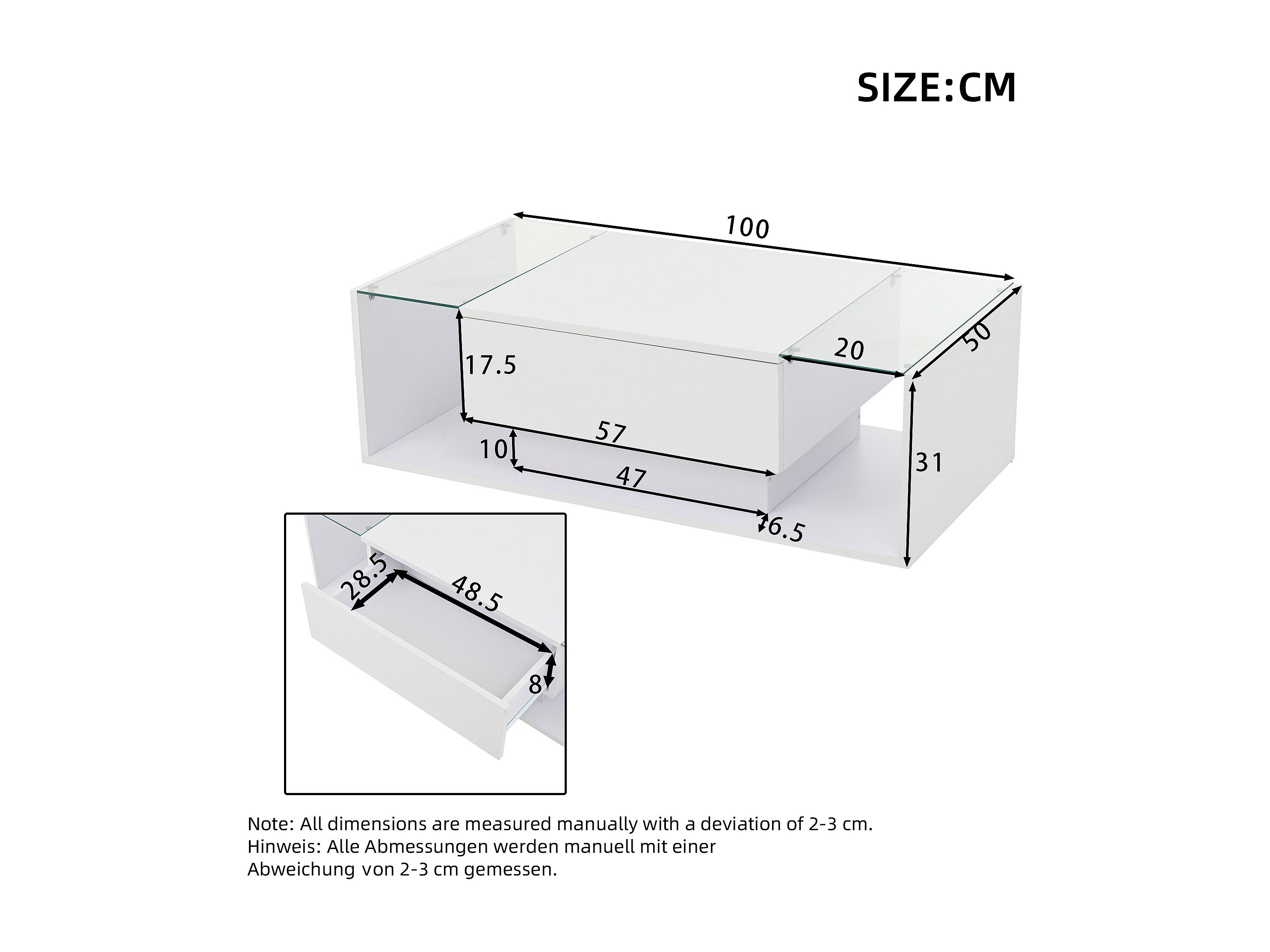 Tavolino bianco con cassetto e illuminazione a LED, tavolino laterale in vetro temperato 100x50x31cm