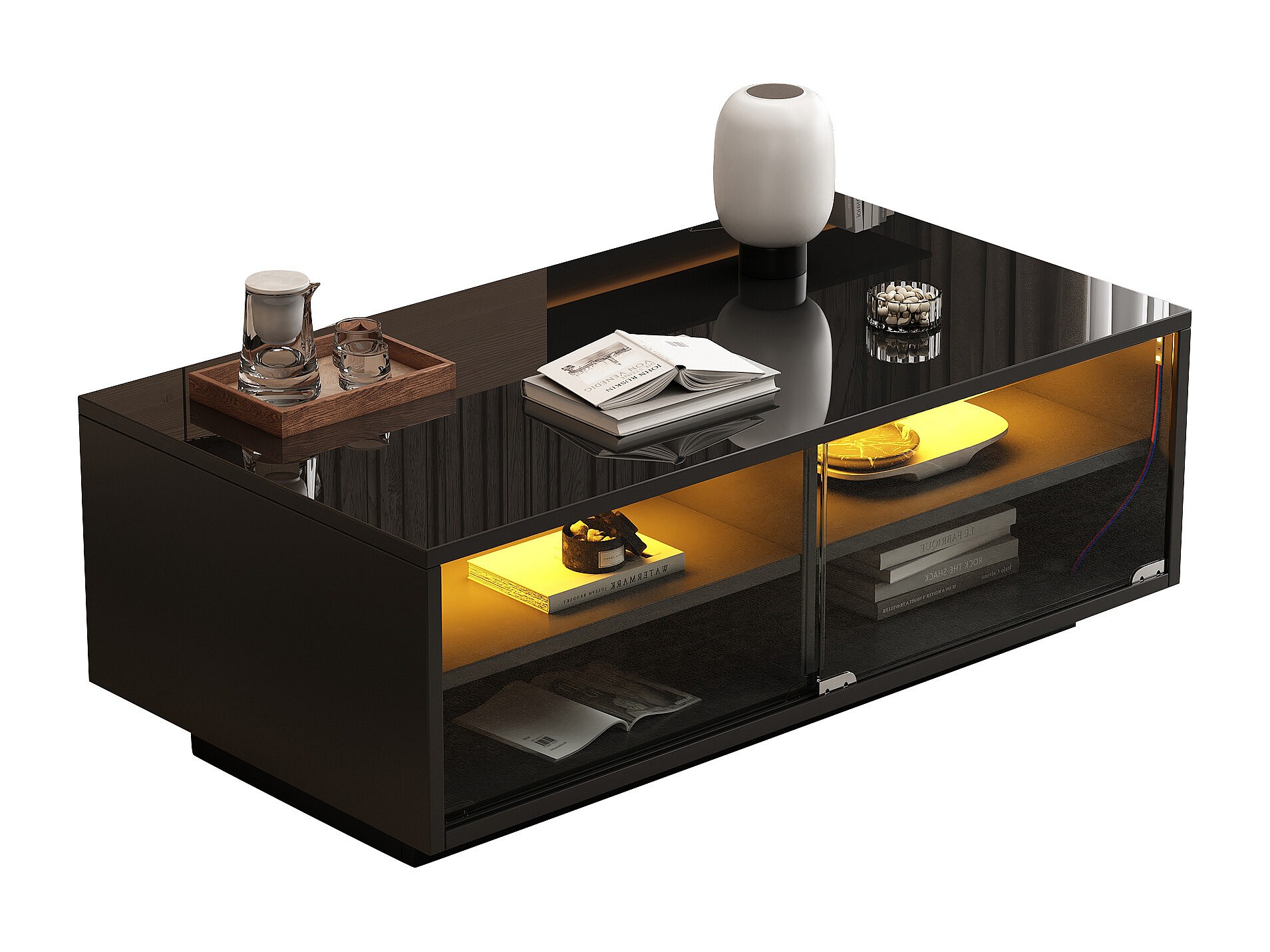 Tavolino da caffè nero lucido - Tavolino da caffè con illuminazione a LED e 2 ante - design in vetro temperato