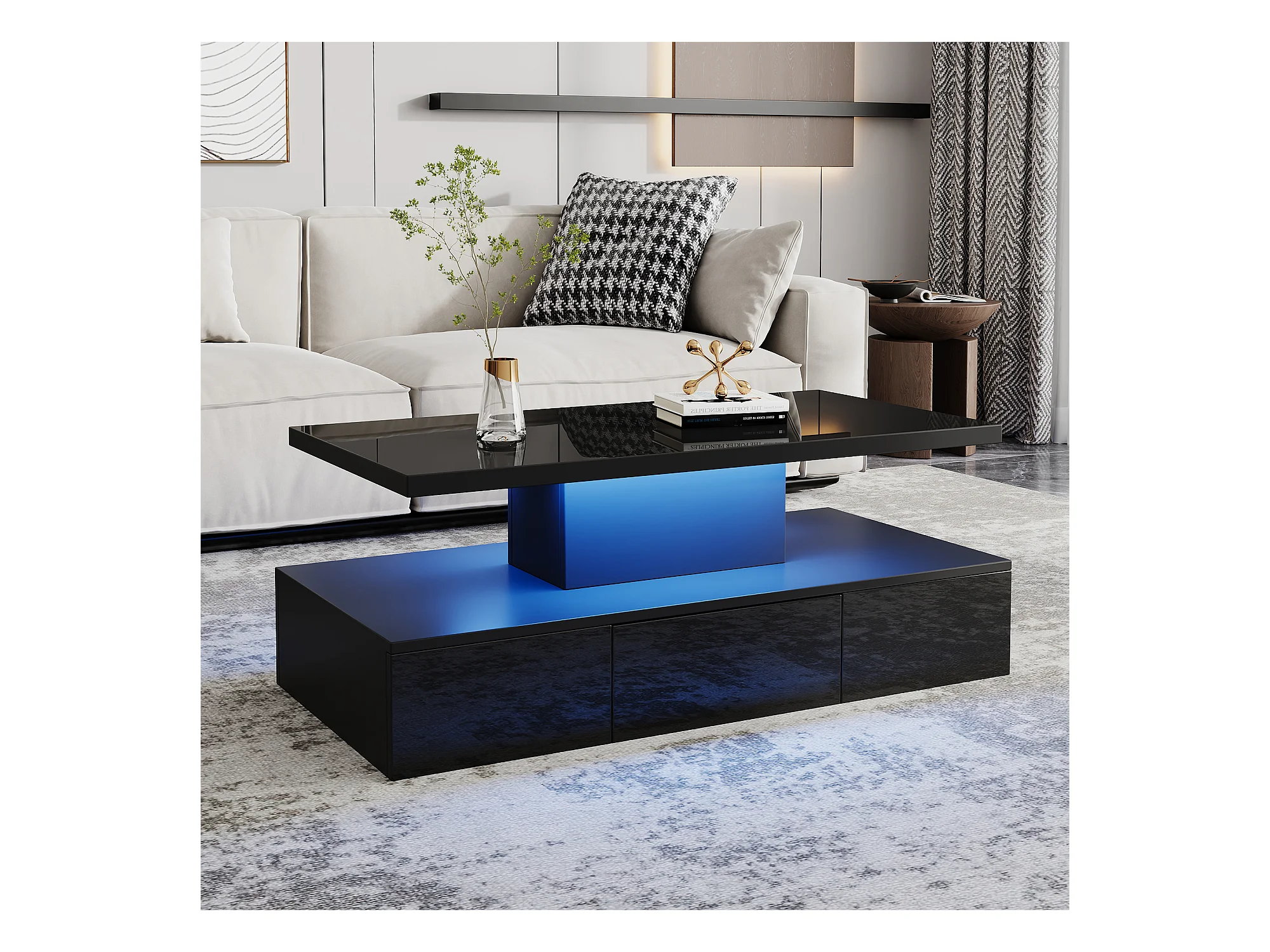 Tavolino moderno con illuminazione a LED, 2 cassetti e piano in acrilico, MDF nero lucido (100x50x35cm)