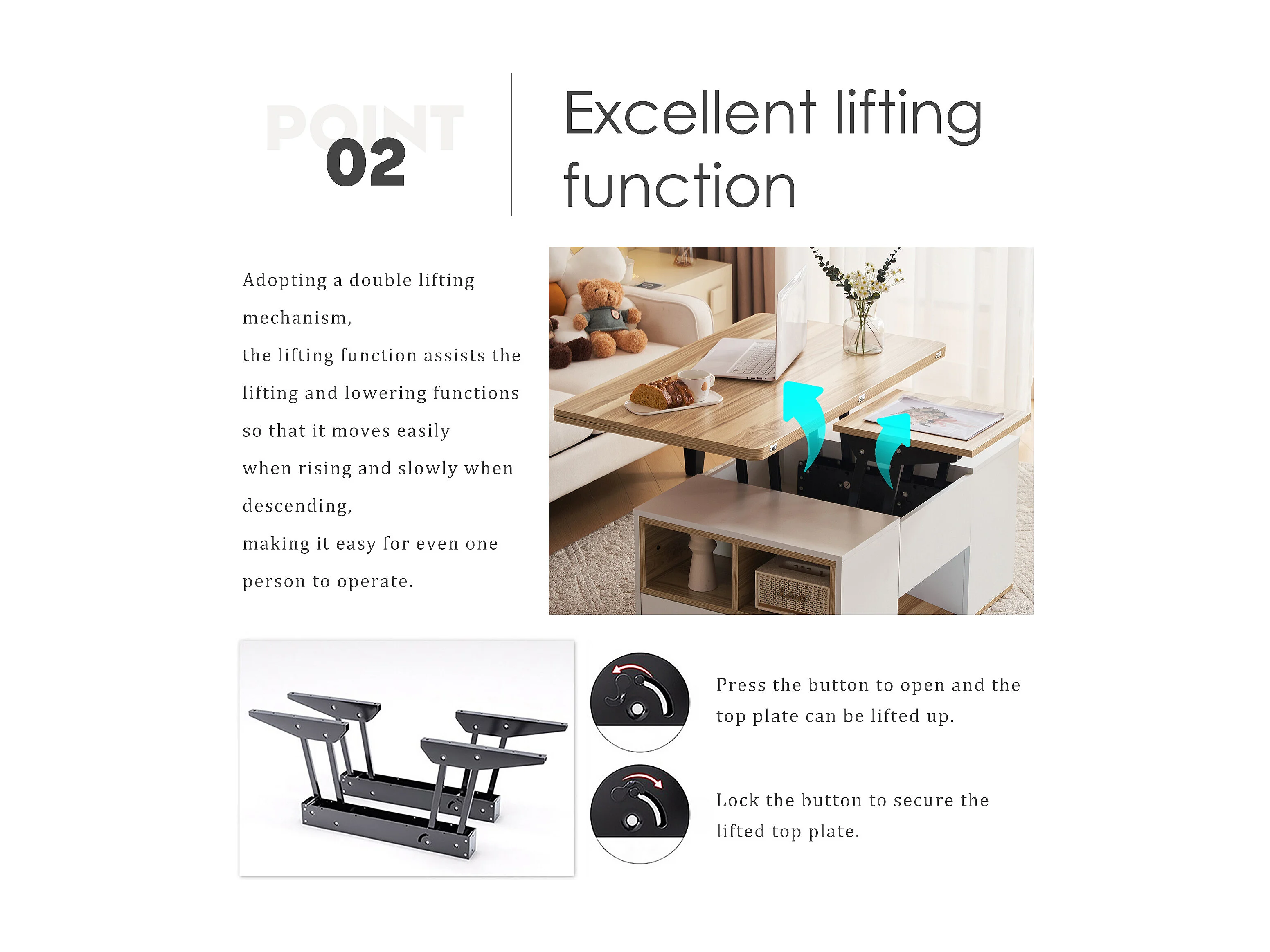 Tavolino da caffè con piano sollevabile, il piano si apre per rivelare 2 tavolini, con 2 cassetti, Mobili per soggiorno, Bianco e legno
