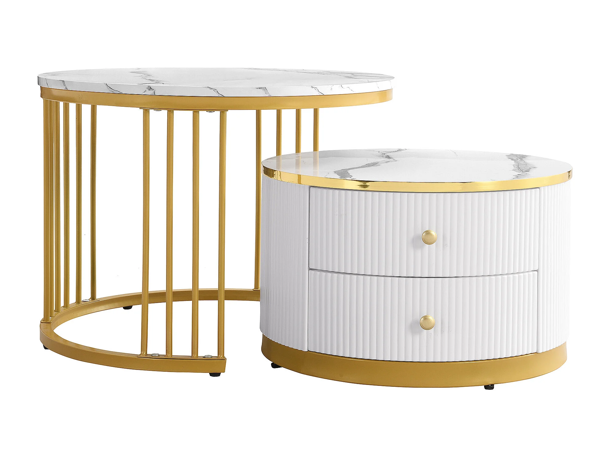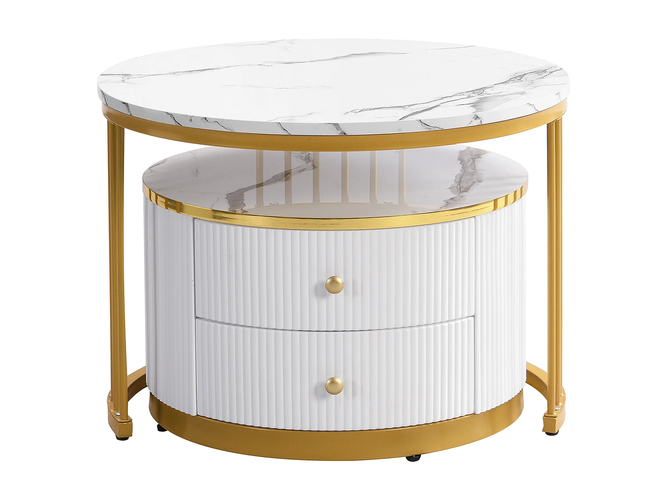 Tavolino da caffè impilabile con 2 cassetti - Piano rotondo effetto marmo - Bianco e oro
