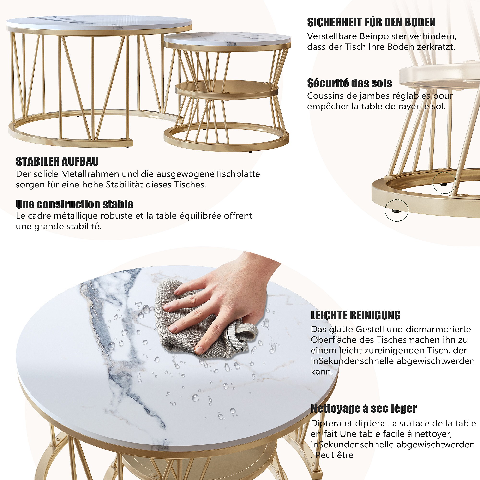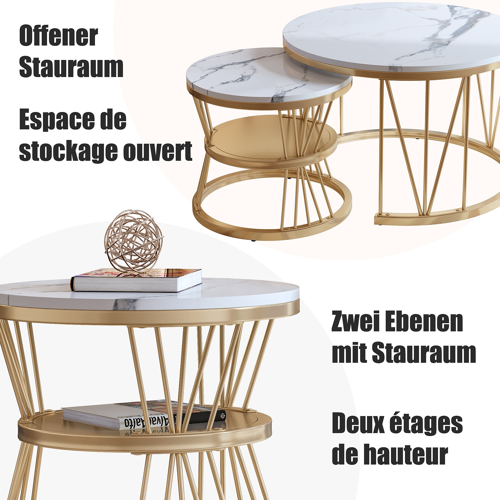 Tavolino da caffè impilabile, impiallacciatura in marmo, struttura in metallo, oro e bianco