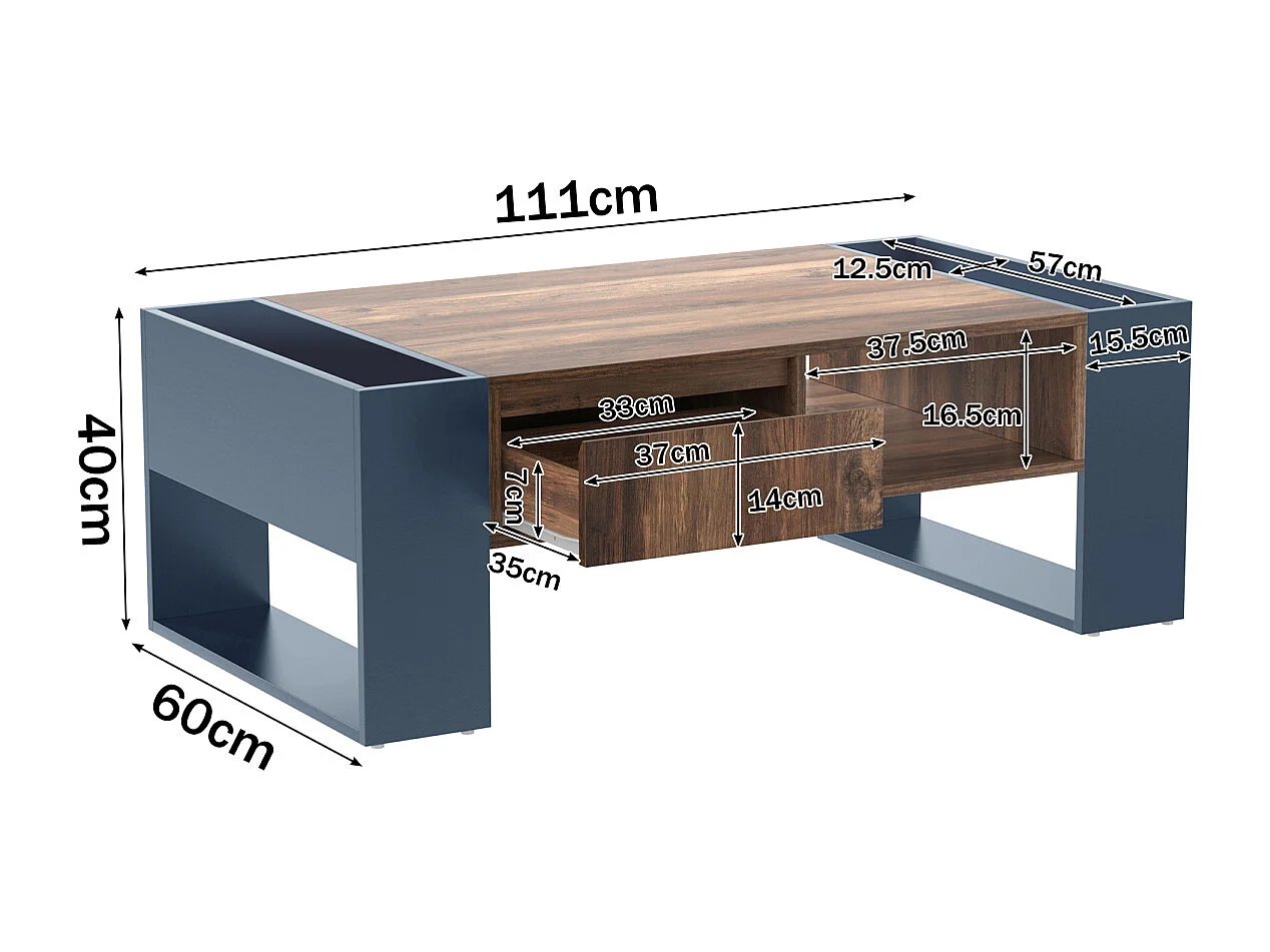 Tavolino da caffè in legno antracite con cassetto senza maniglia e spazio di archiviazione bifacciale.