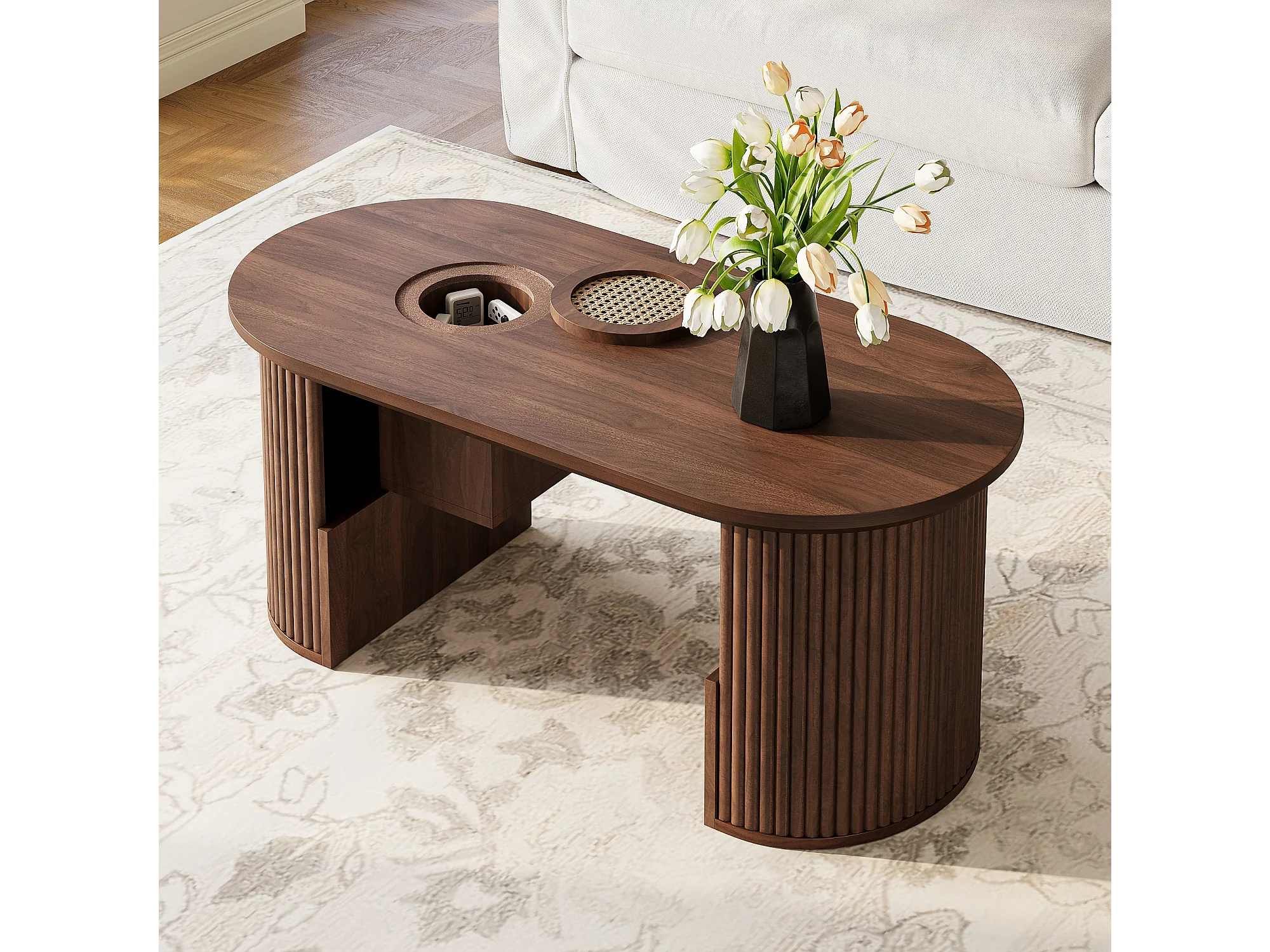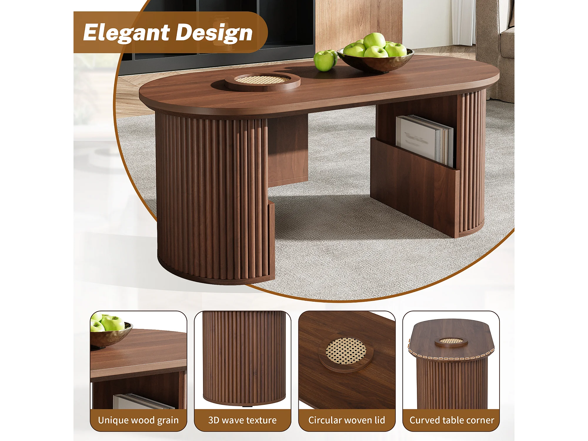 Tavolino da caffè in noce con struttura verticale e contenitore, 105 x 50 x 46,5 cm