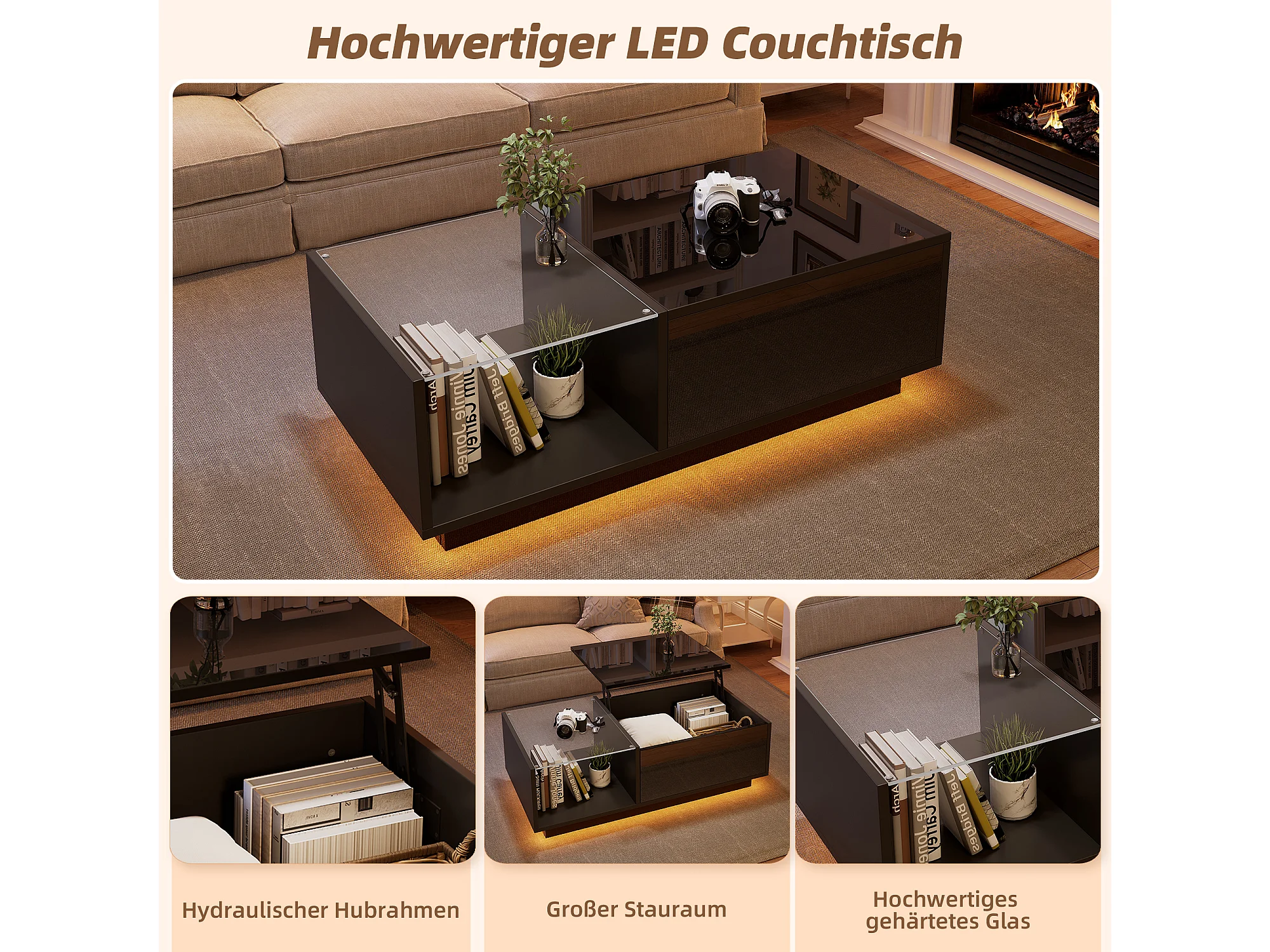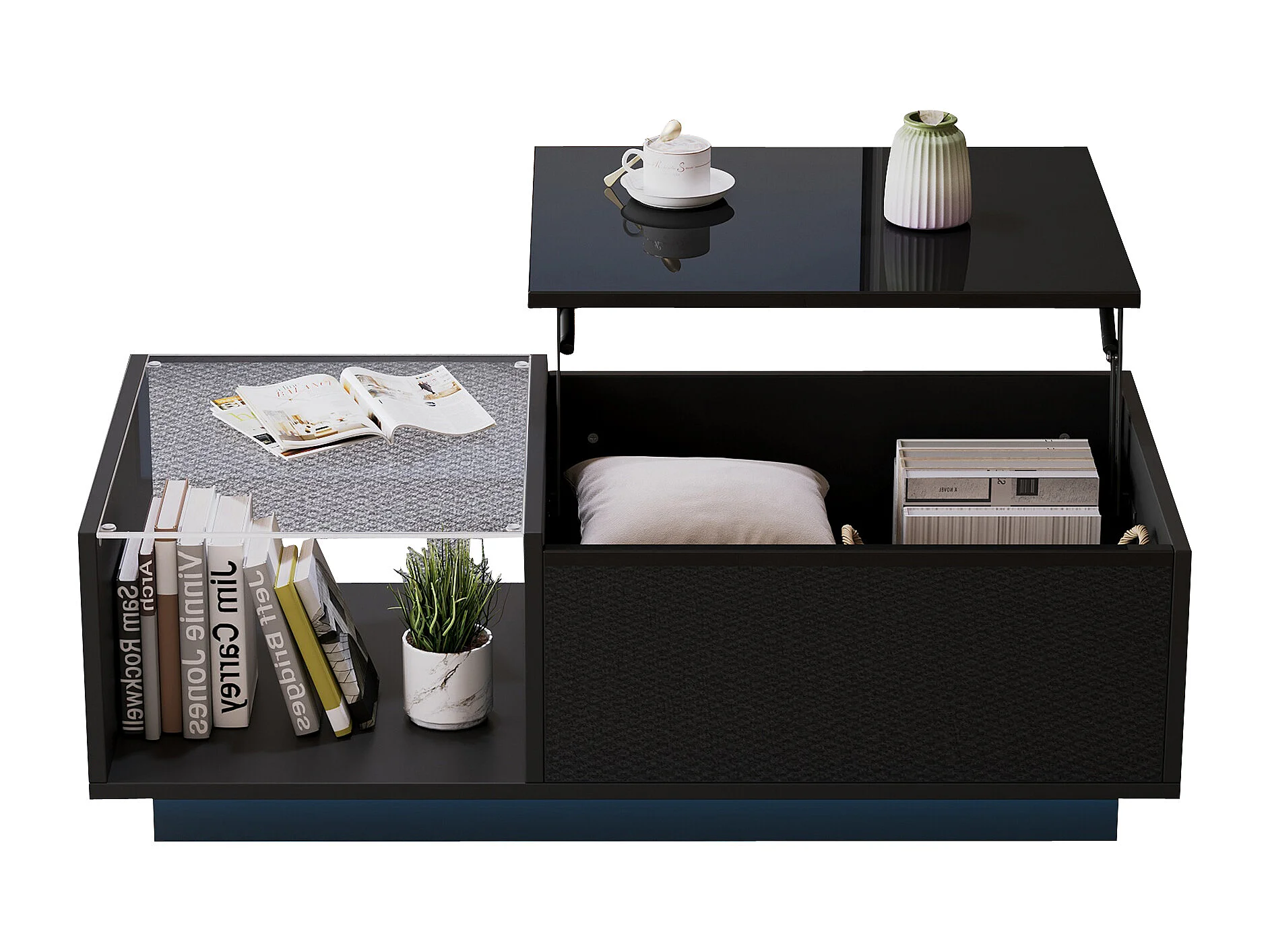 Tavolino da caffè a LED, tavolino da caffè estensibile con piano sollevabile, spazio nascosto e ripiano, nero