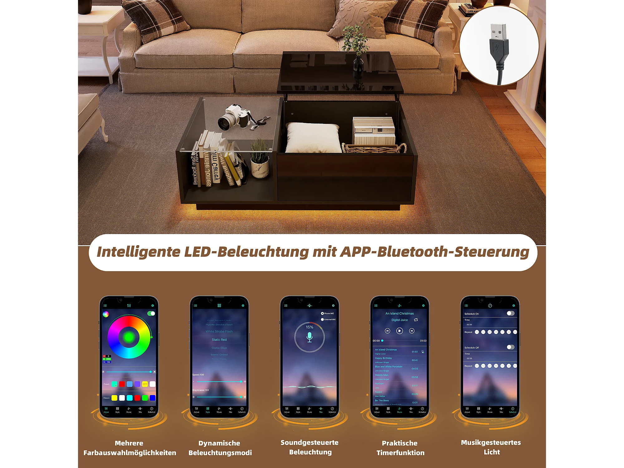 Tavolino da caffè con piano sollevabile, luce LED, spazio nascosto, porta USB e di ricarica, 100x50x35 cm, nero