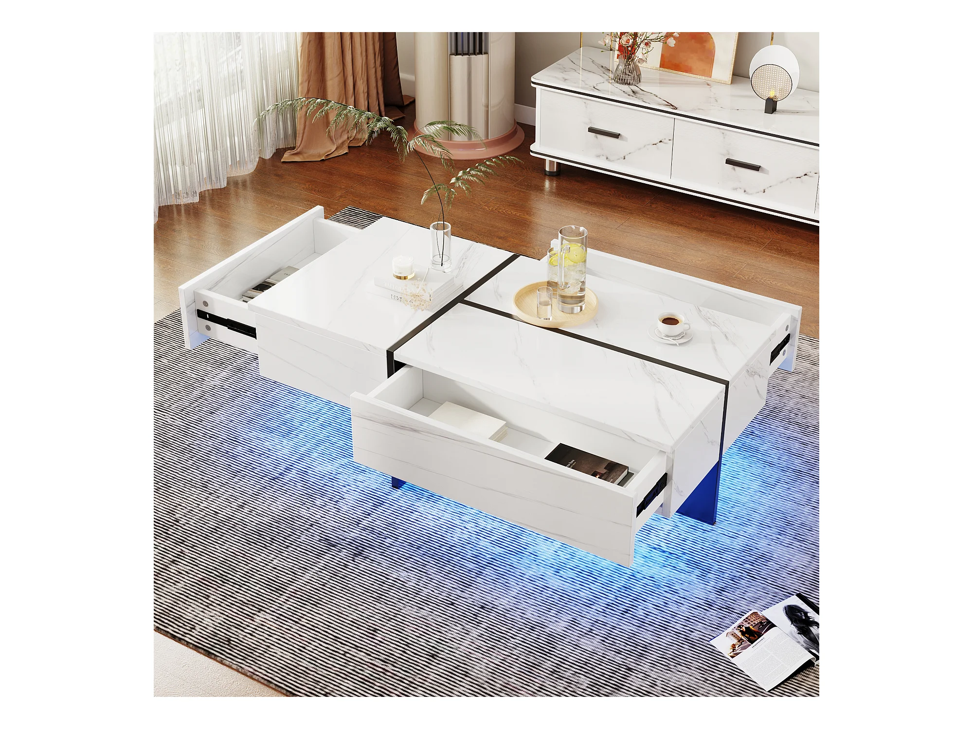 Tavolino da caffè effetto marmo bianco con illuminazione a LED, piano in vetro e 2 cassetti, pannelli in MDF (100x50x35cm)