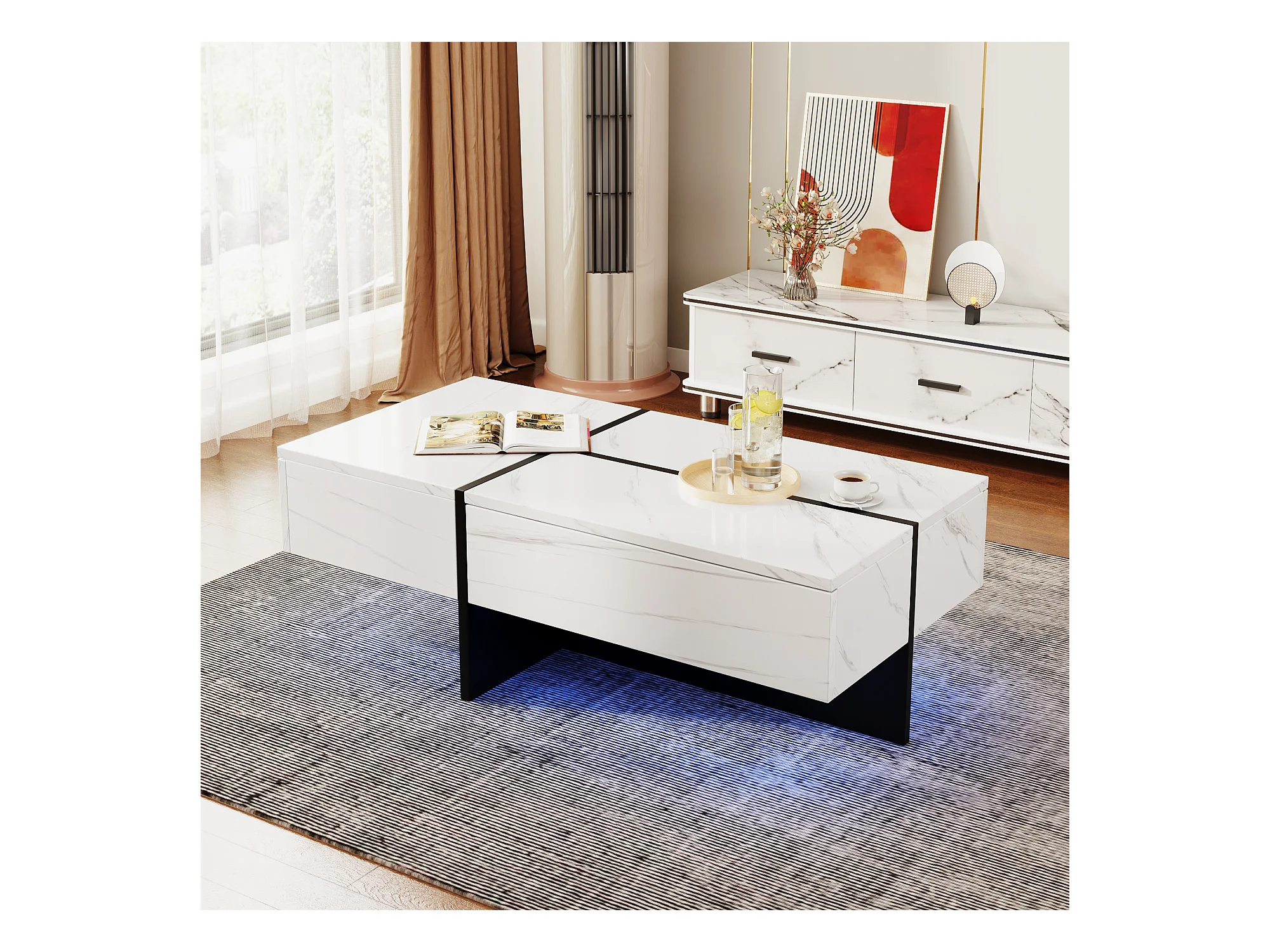 Tavolino da caffè lucido con superficie effetto marmo bianco, struttura colorblock nera, con illuminazione LED controllata tramite app (100x50x34,5 cm)