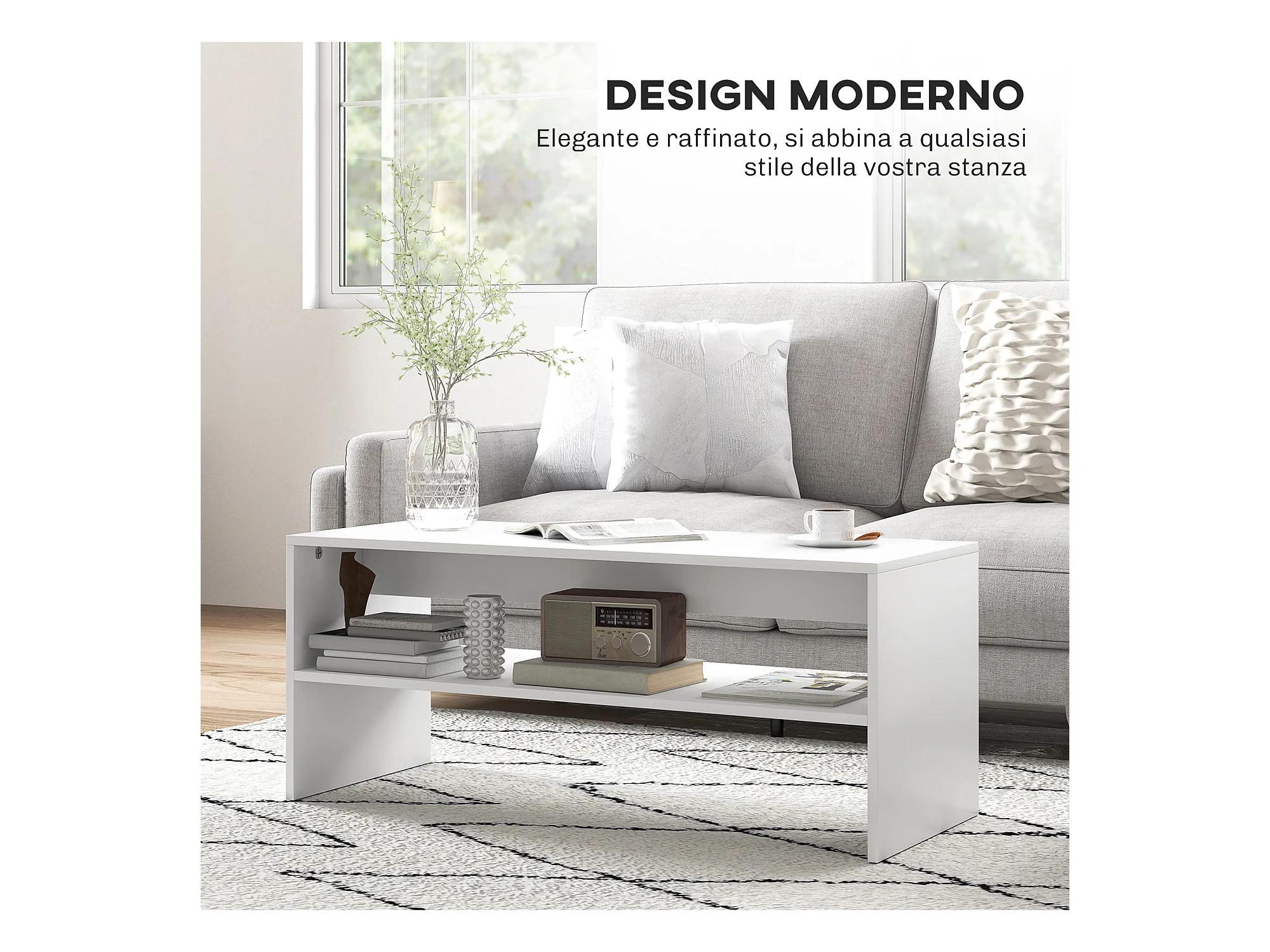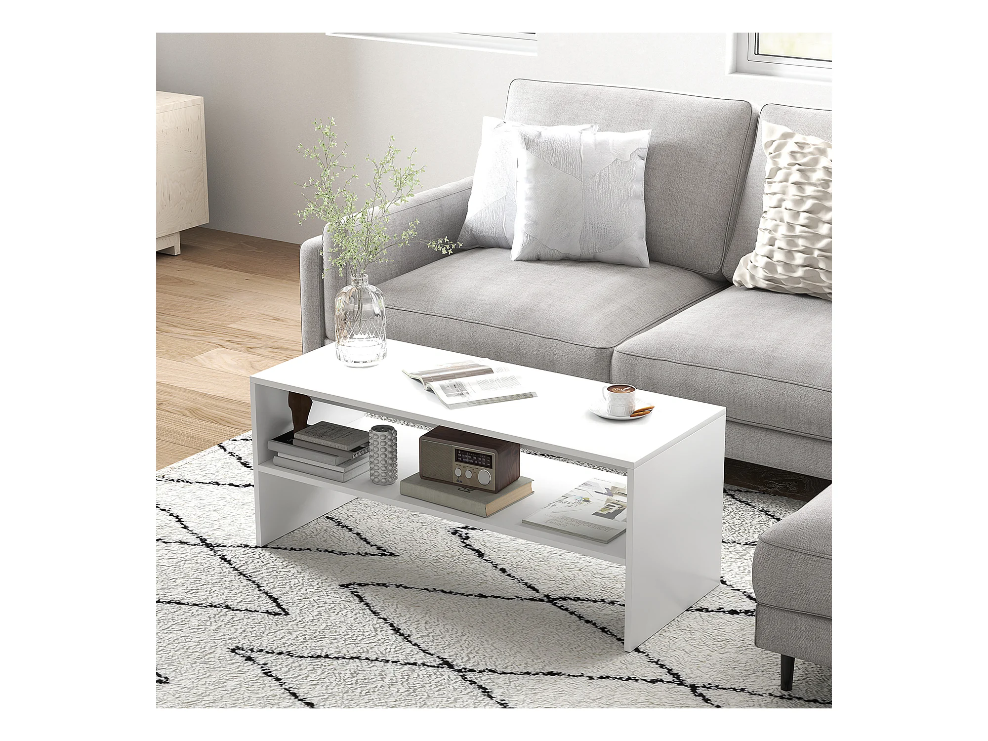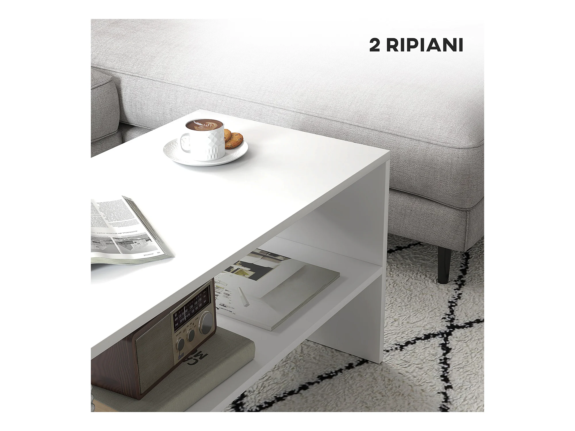 Tavolino da caffè moderno 2 livelli con ripiano aperto in legno bianco