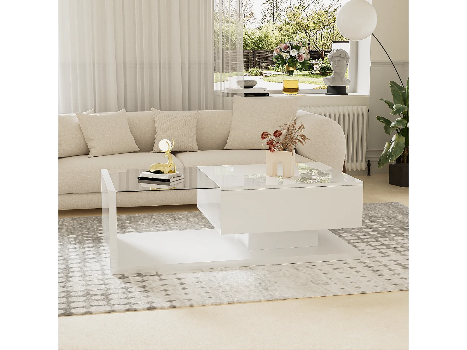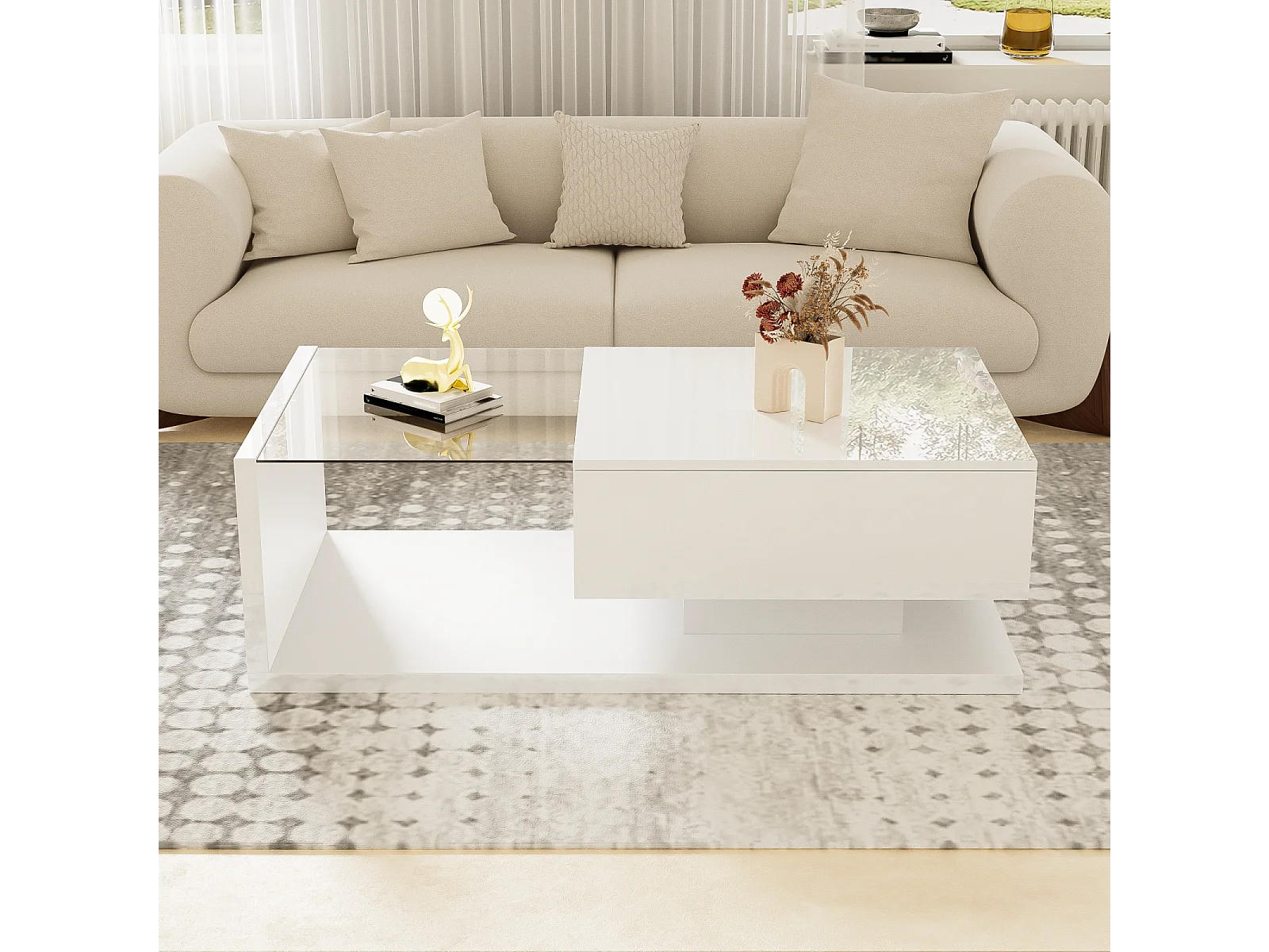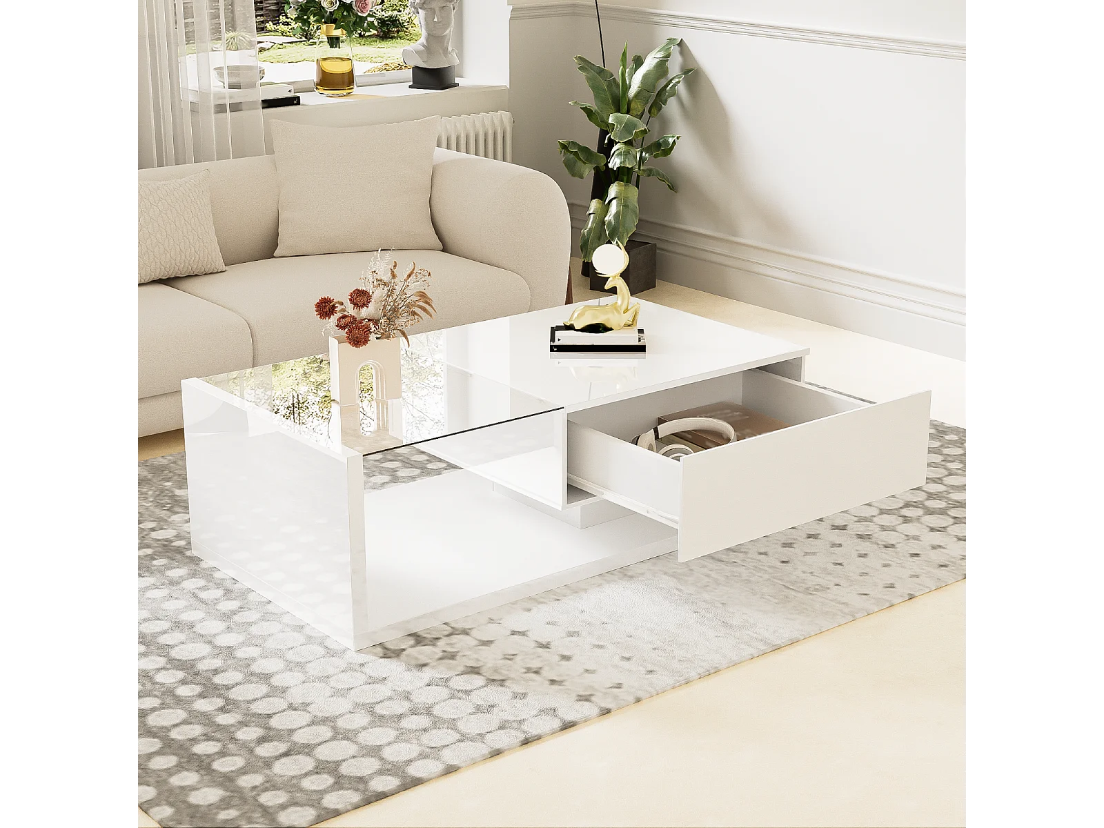Tavolino da caffè moderno a LED, vetro bianco e legno con ampio cassetto, soggiorno, 105x55x32,5 cm