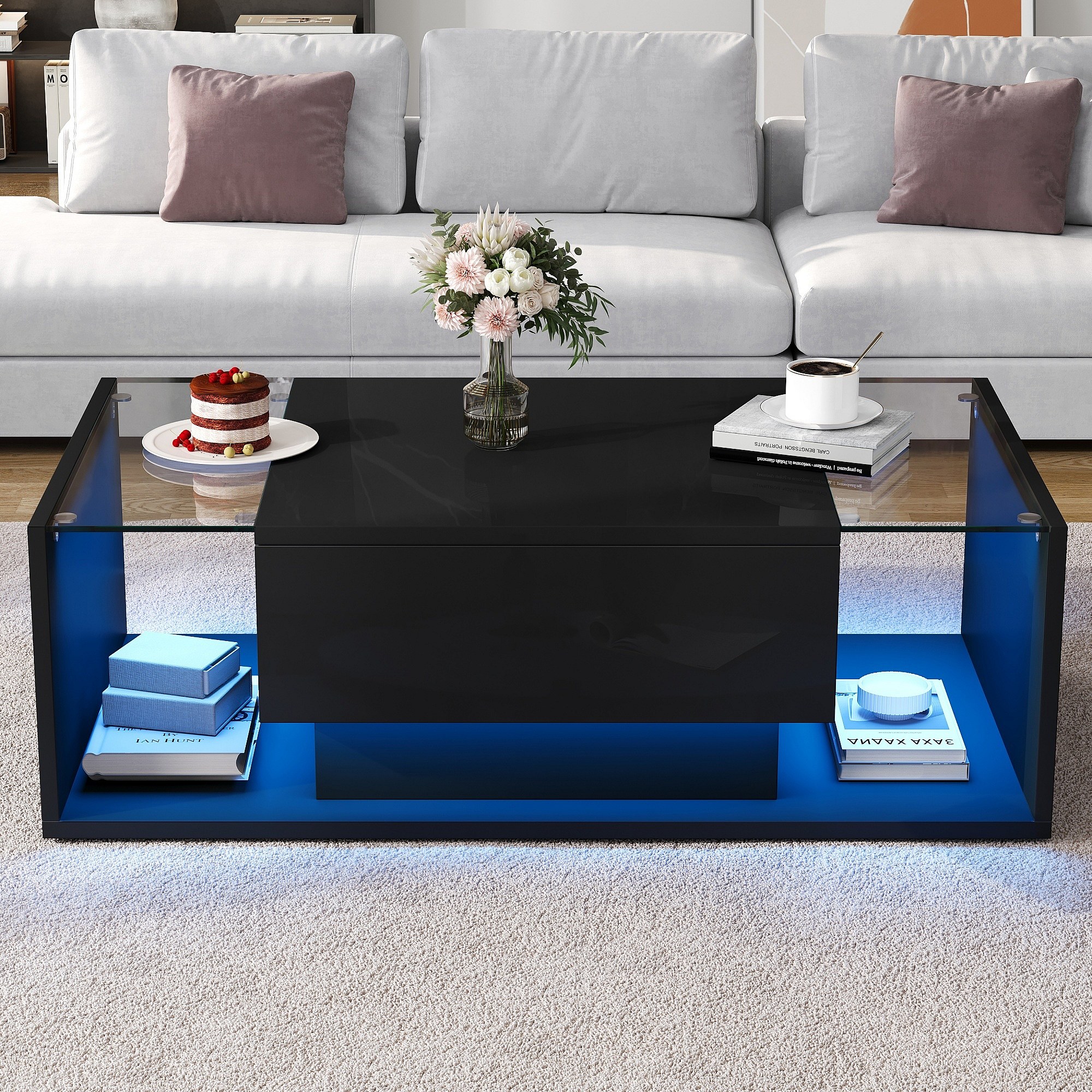 Tavolino da caffè nero lucido - Tavolino da caffè con 2 cassetti e illuminazione a LED - pannello porta a ribalta
