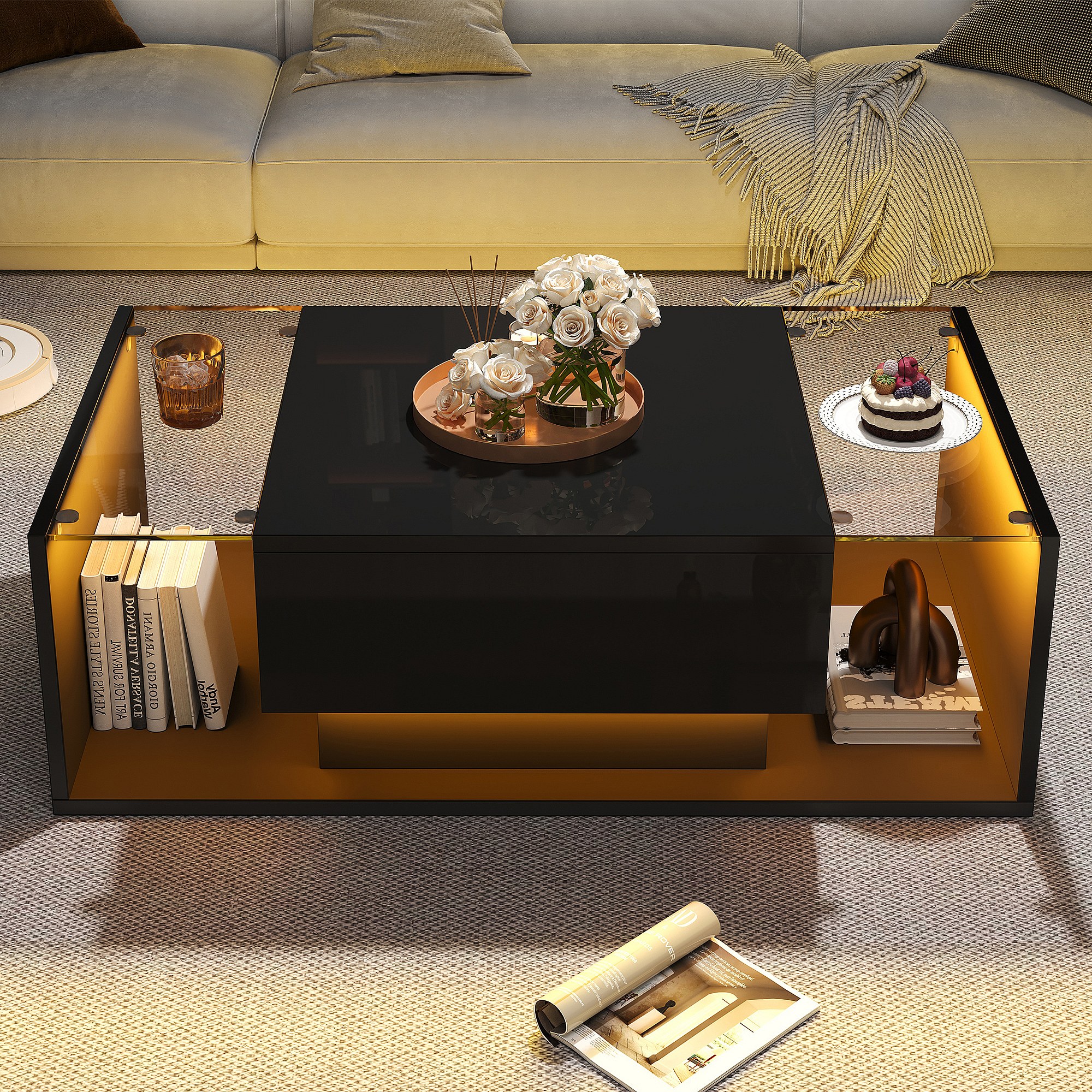 Tavolino da caffè nero - tavolino da caffè lucido con striscia luminosa a LED - 4 cassetti - per soggiorno e ufficio